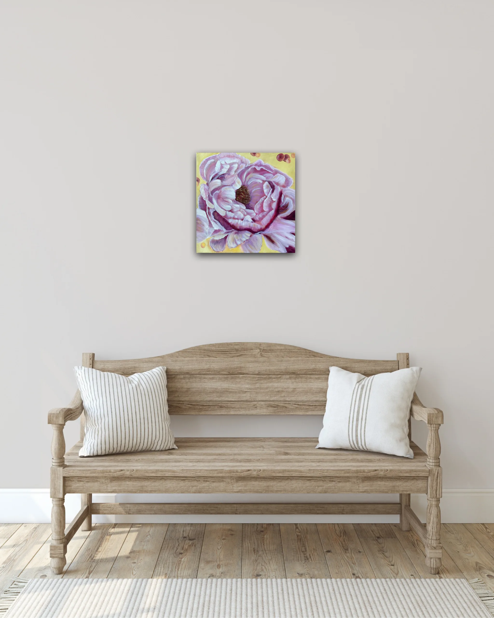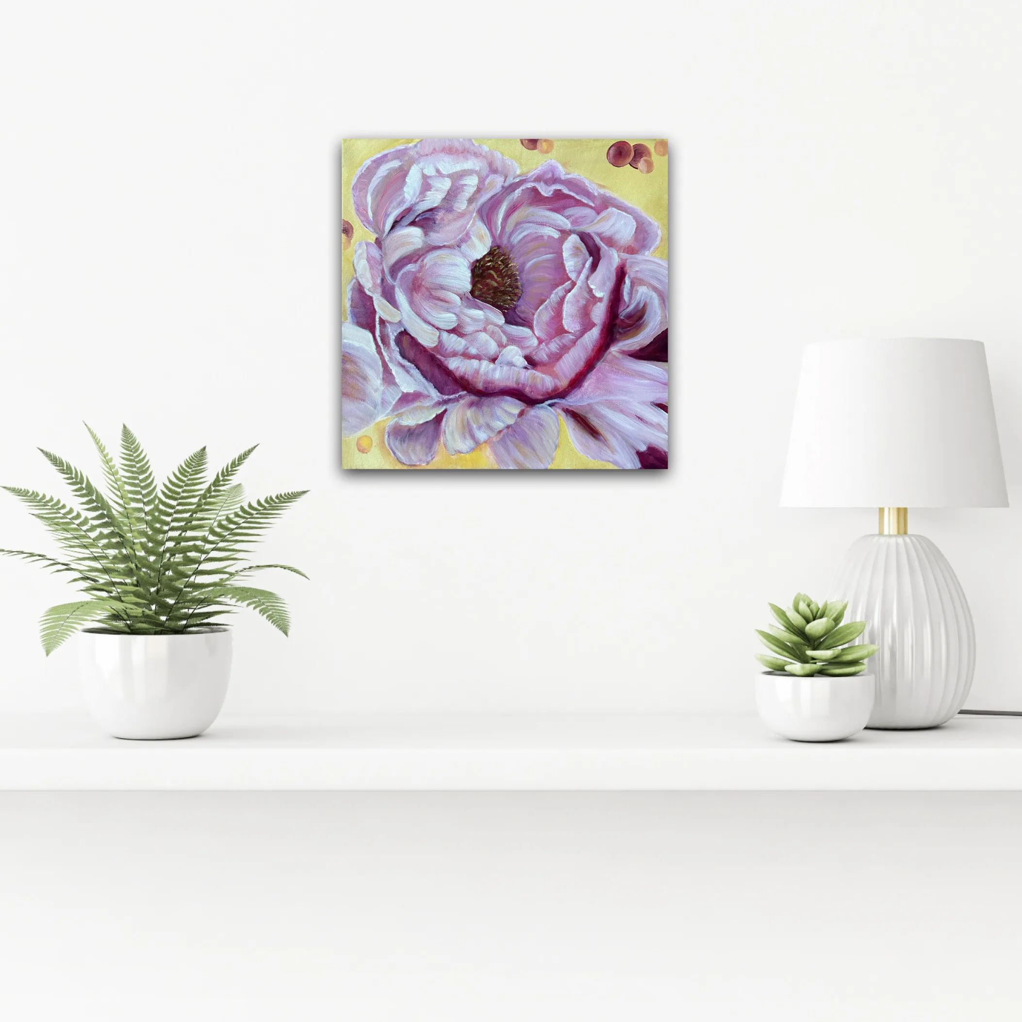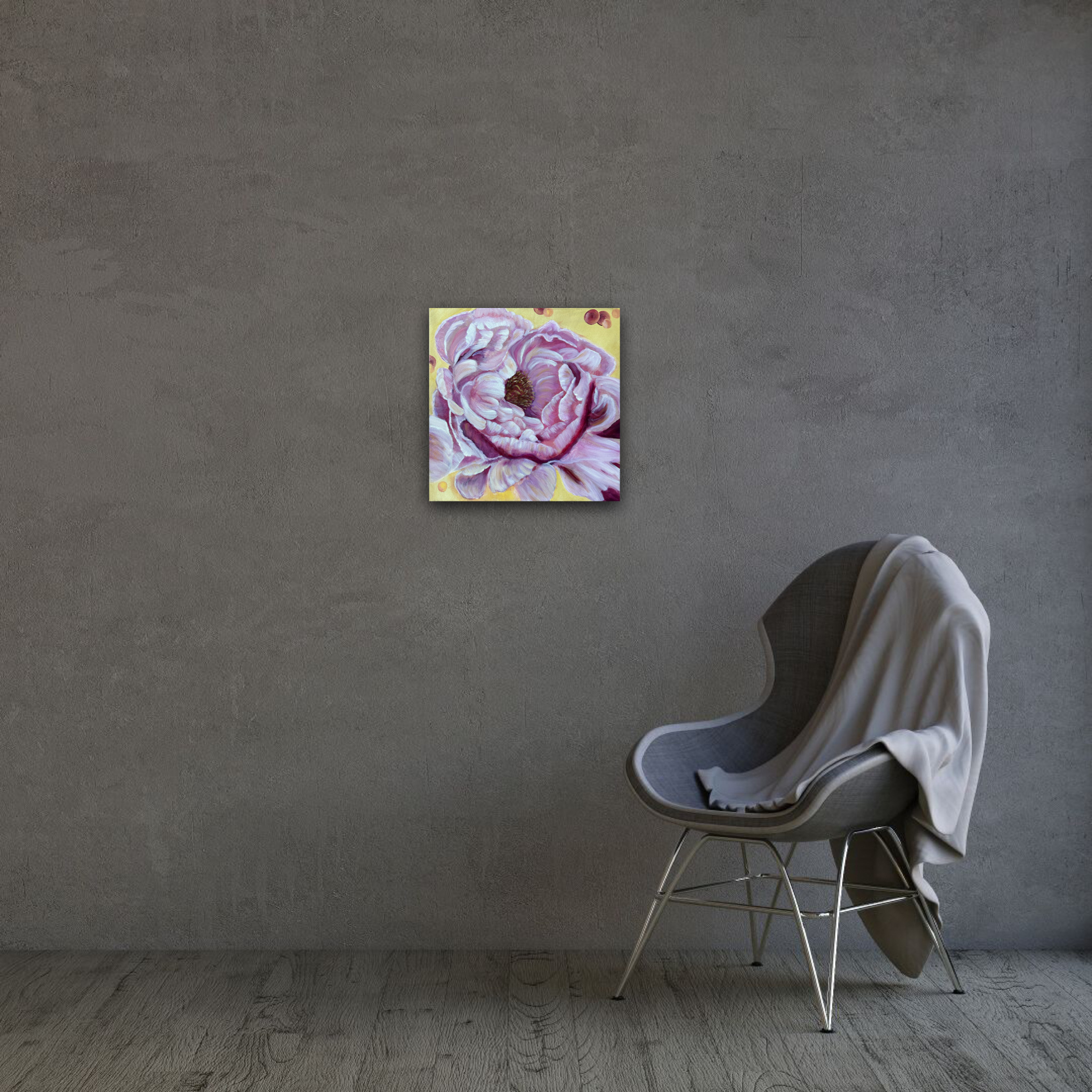 Den gyllene bakgrunden fungerar som en varm, omslutande omfamning, och får blomman att nästan sväva fritt. Det är en tavla som talar om livets rörelse, om att våga stå i sitt eget ljus och låta färgerna ta plats. ”Blomstrande Passion” är mer än ett konstverk – det är en känsla, en uppmaning att leva fullt ut, med hela hjärtat och själen.”