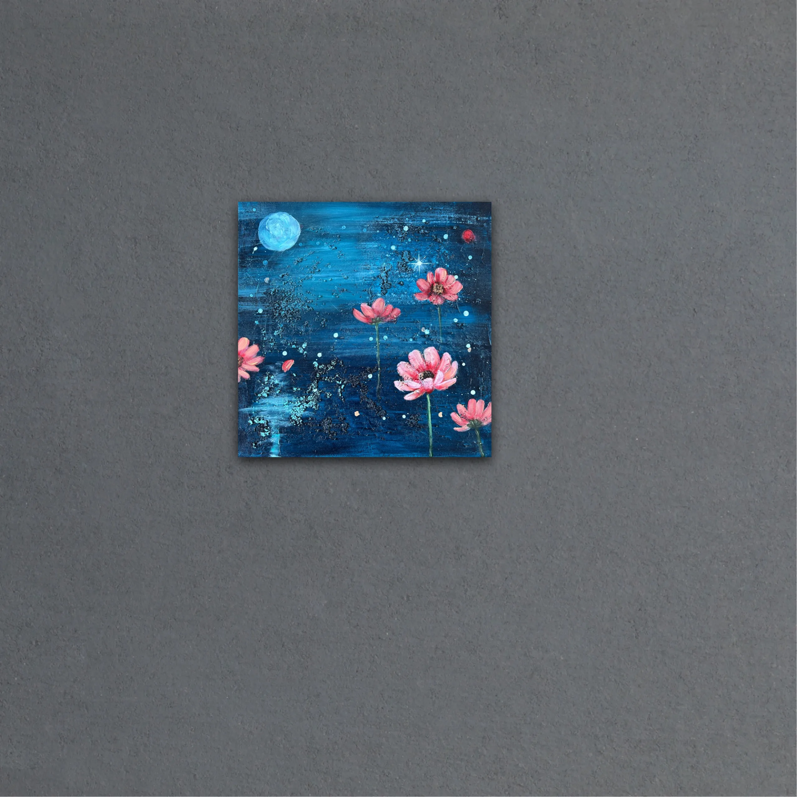 40 x 40 x 2 cm Blandteknik, akryl och olja på canvas Blossom of the Night Sky är en originalmålning som utforskar kontrasten mellan mörker och ljus.