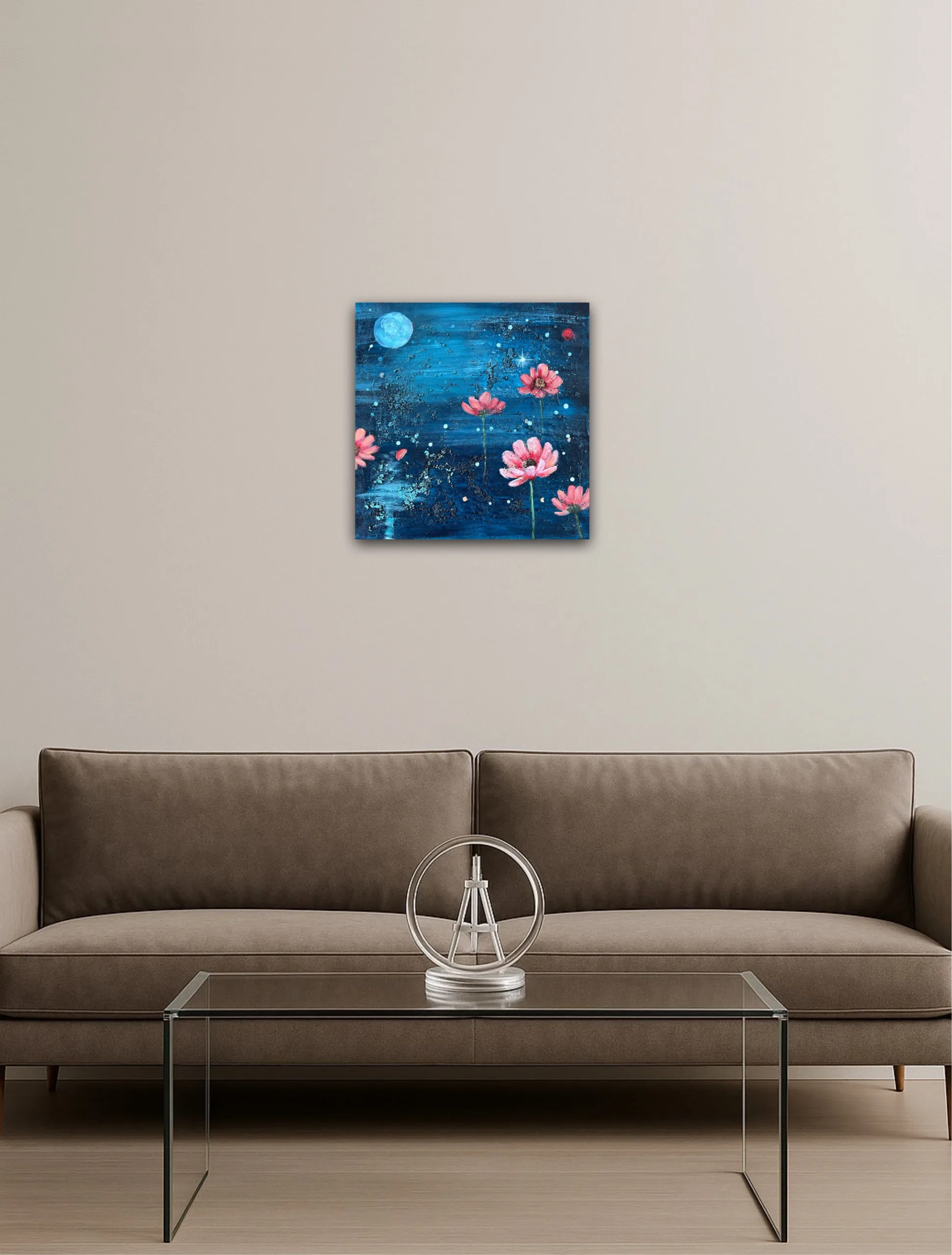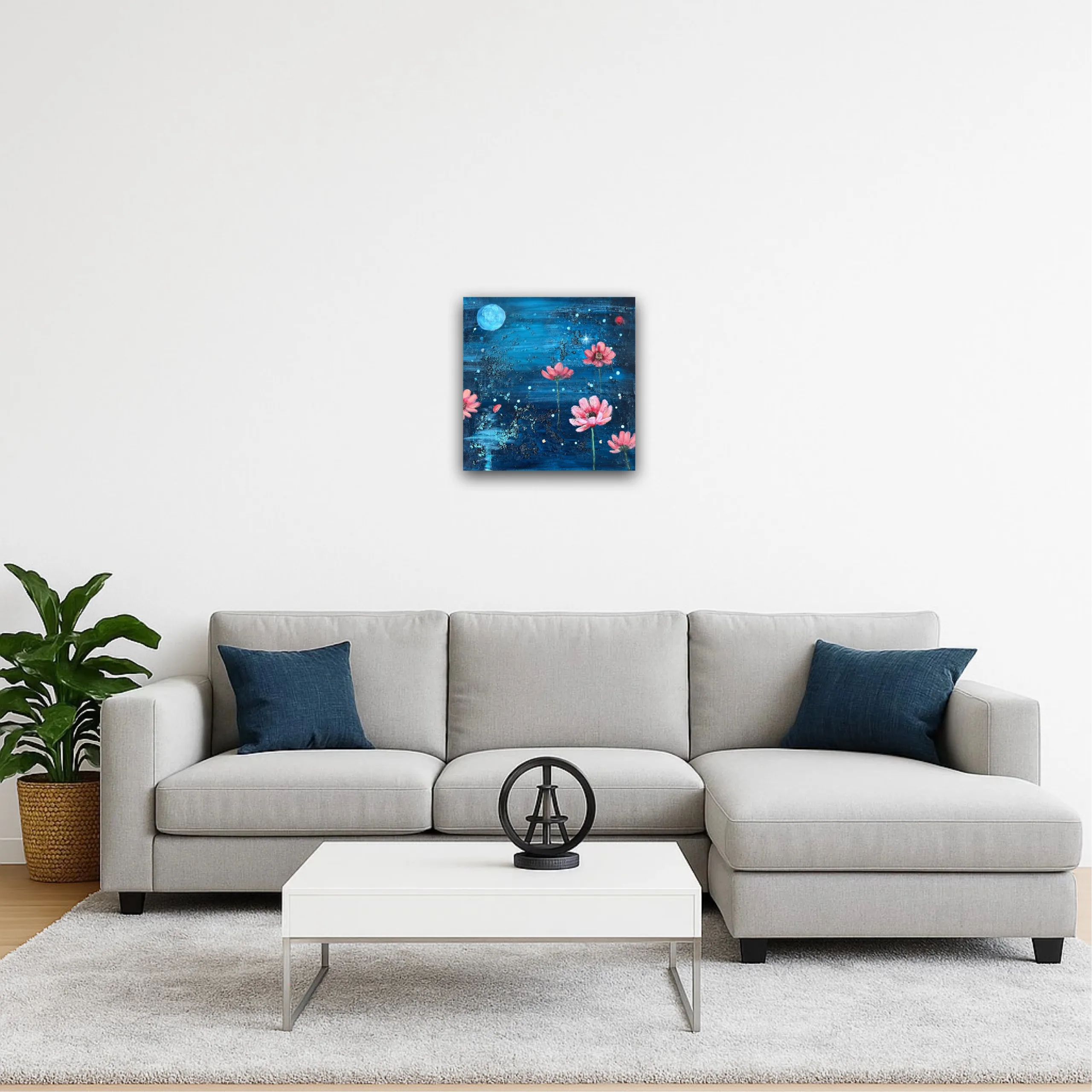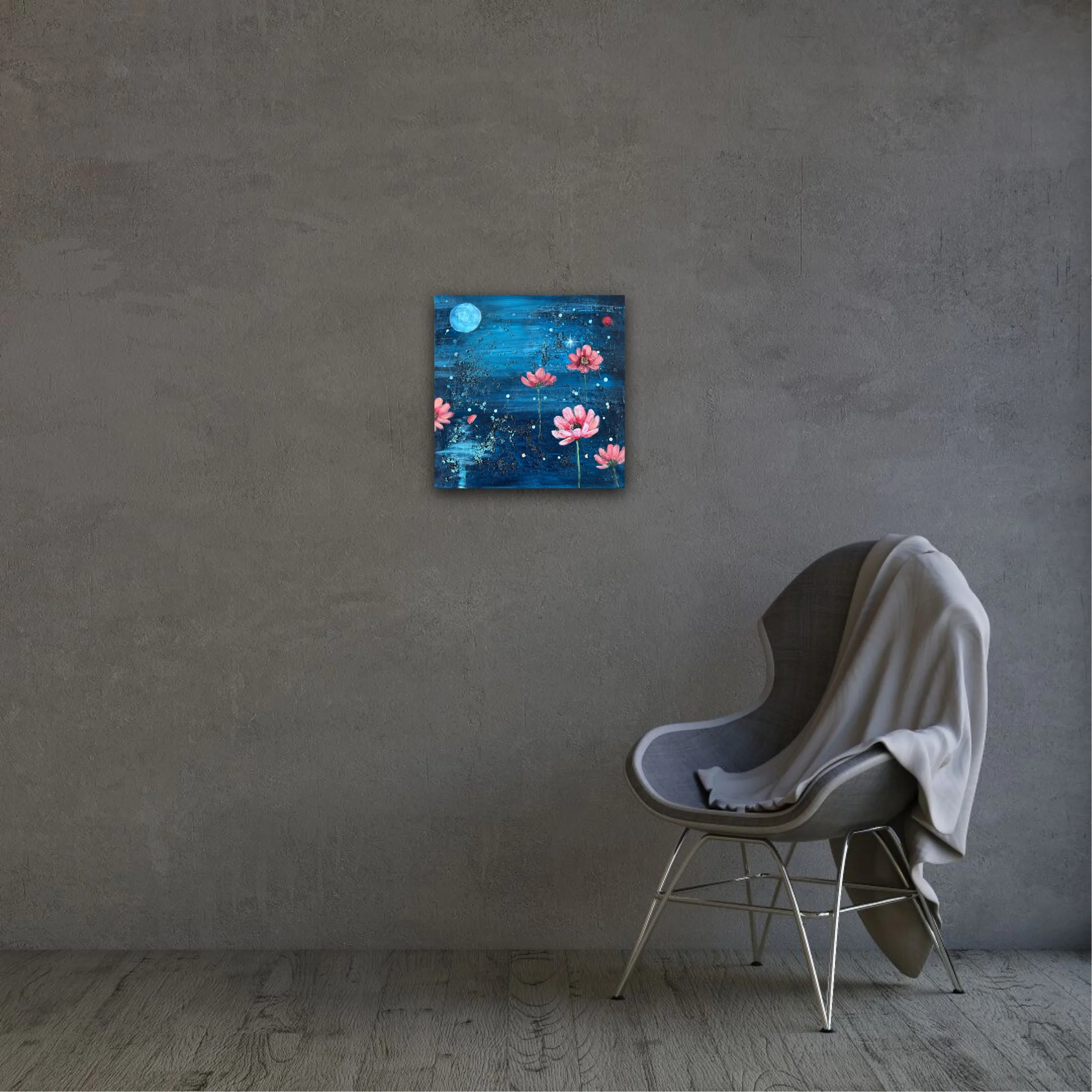 Blossom of the Night Sky är en originalmålning som utforskar kontrasten mellan mörker och ljus, där möts natthimlens oändlighet och naturens stilla skönhet.