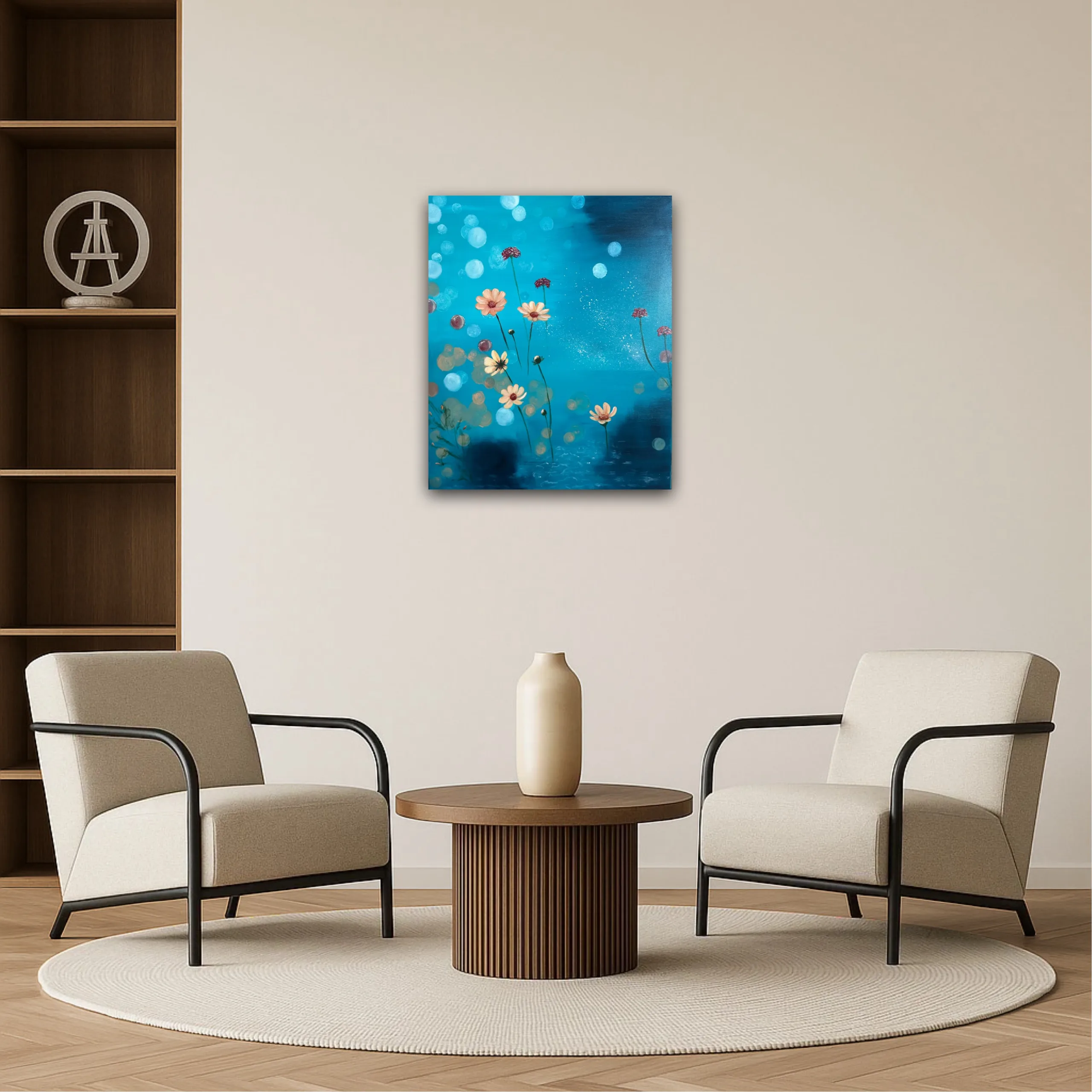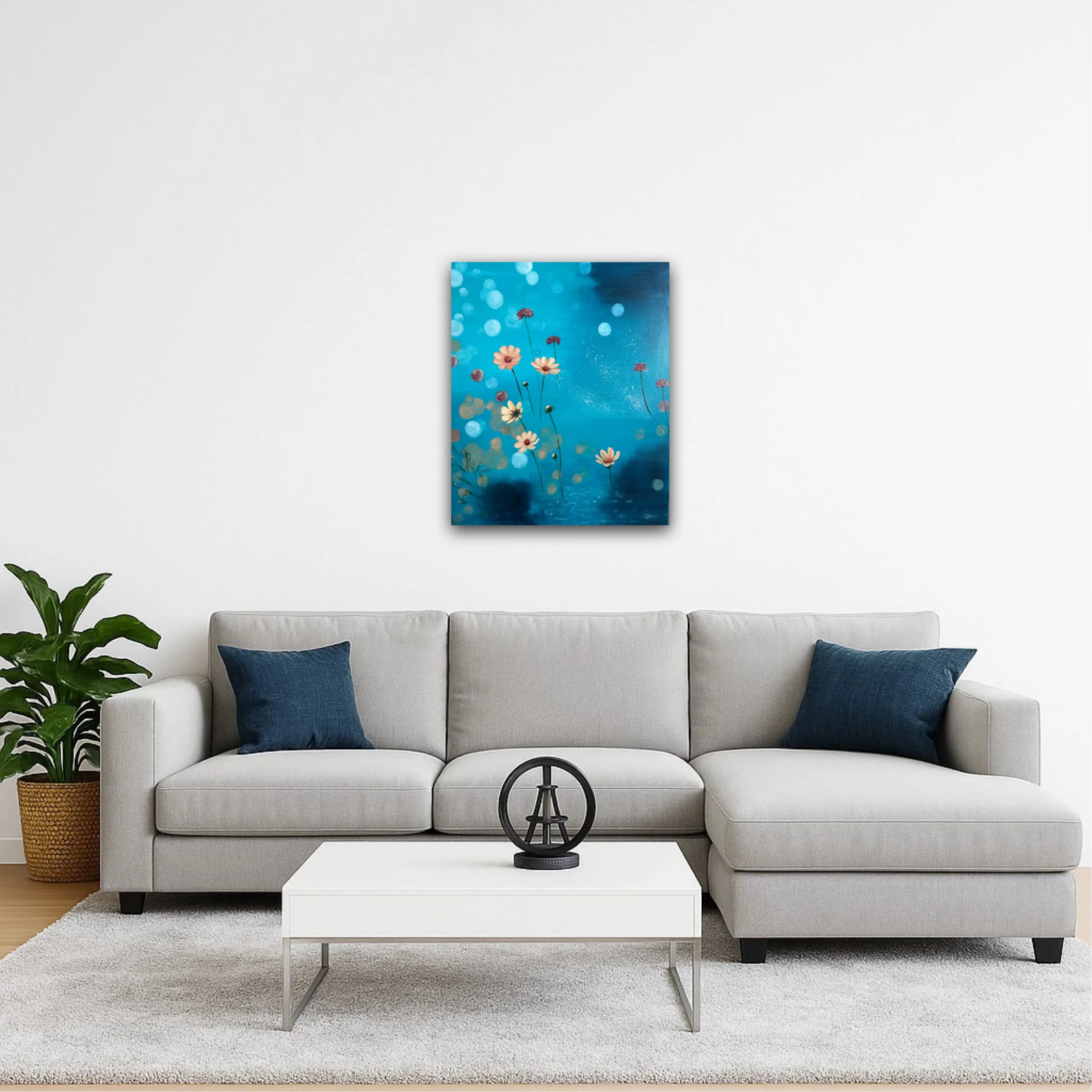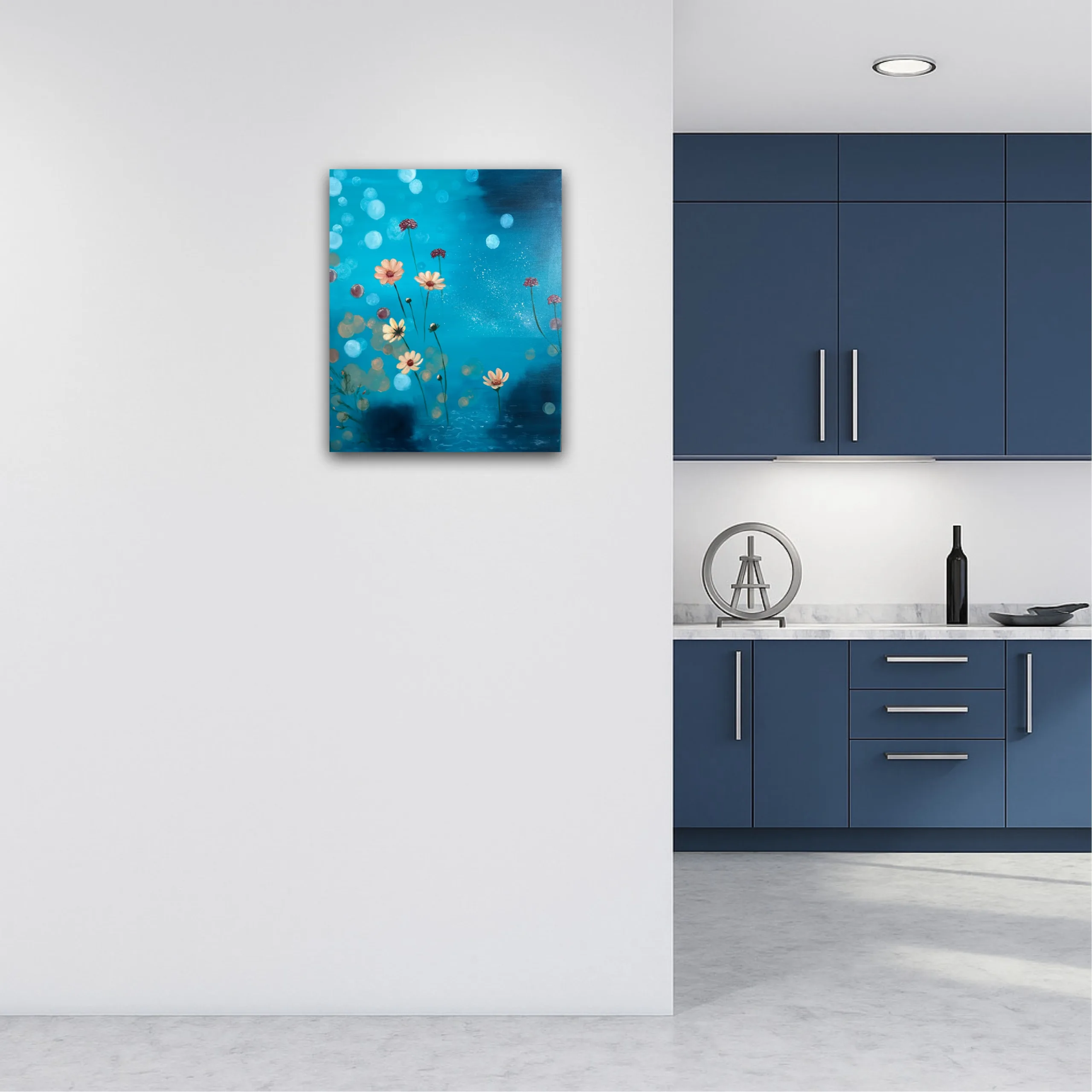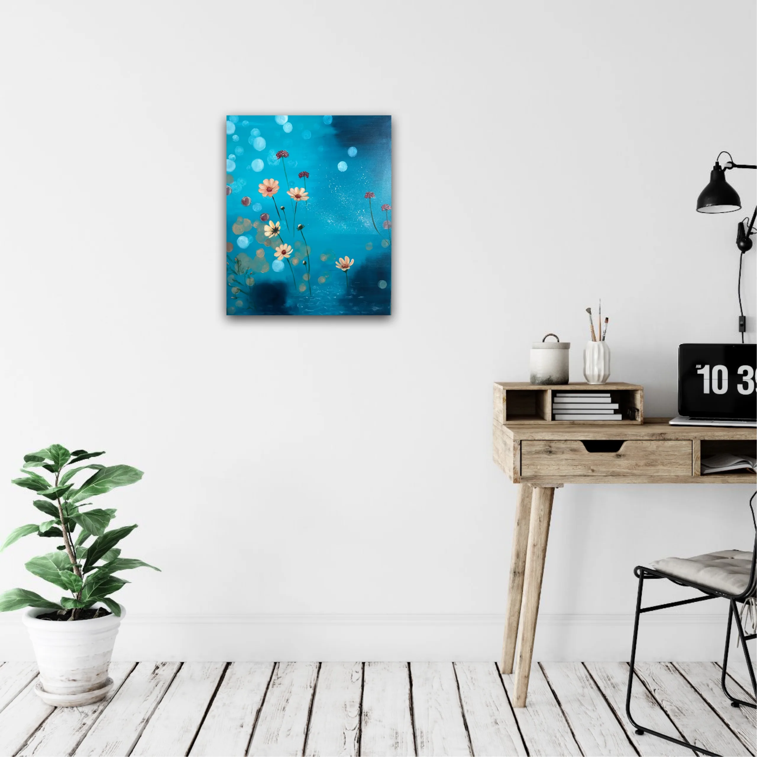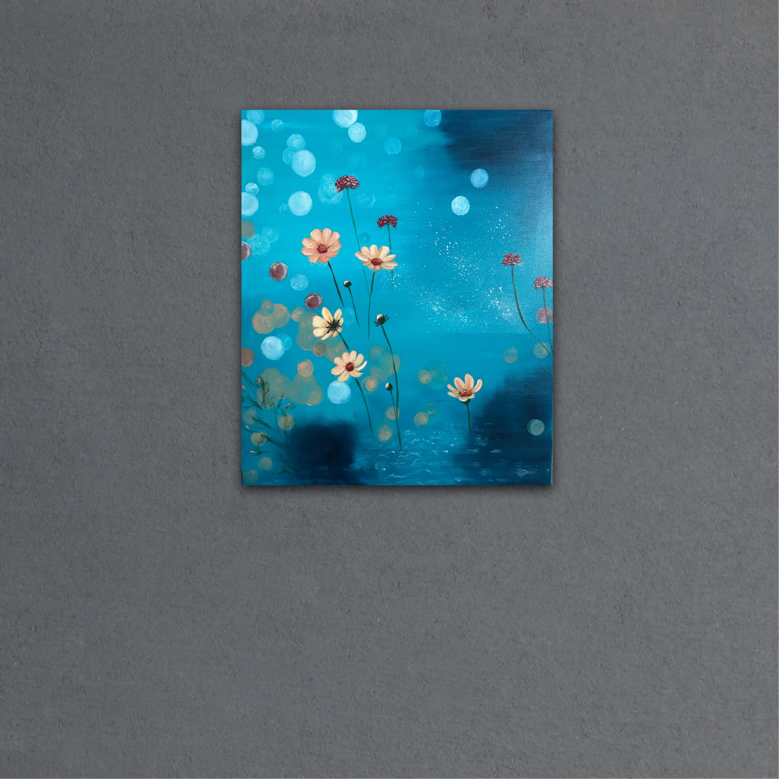 50 x 60 cm, Akryl och olja på canvas. En abstrakt målning i blå, grönturkosa toner som förmedlar lugn, natur och stillhet. Skapad av Art by Lycke.