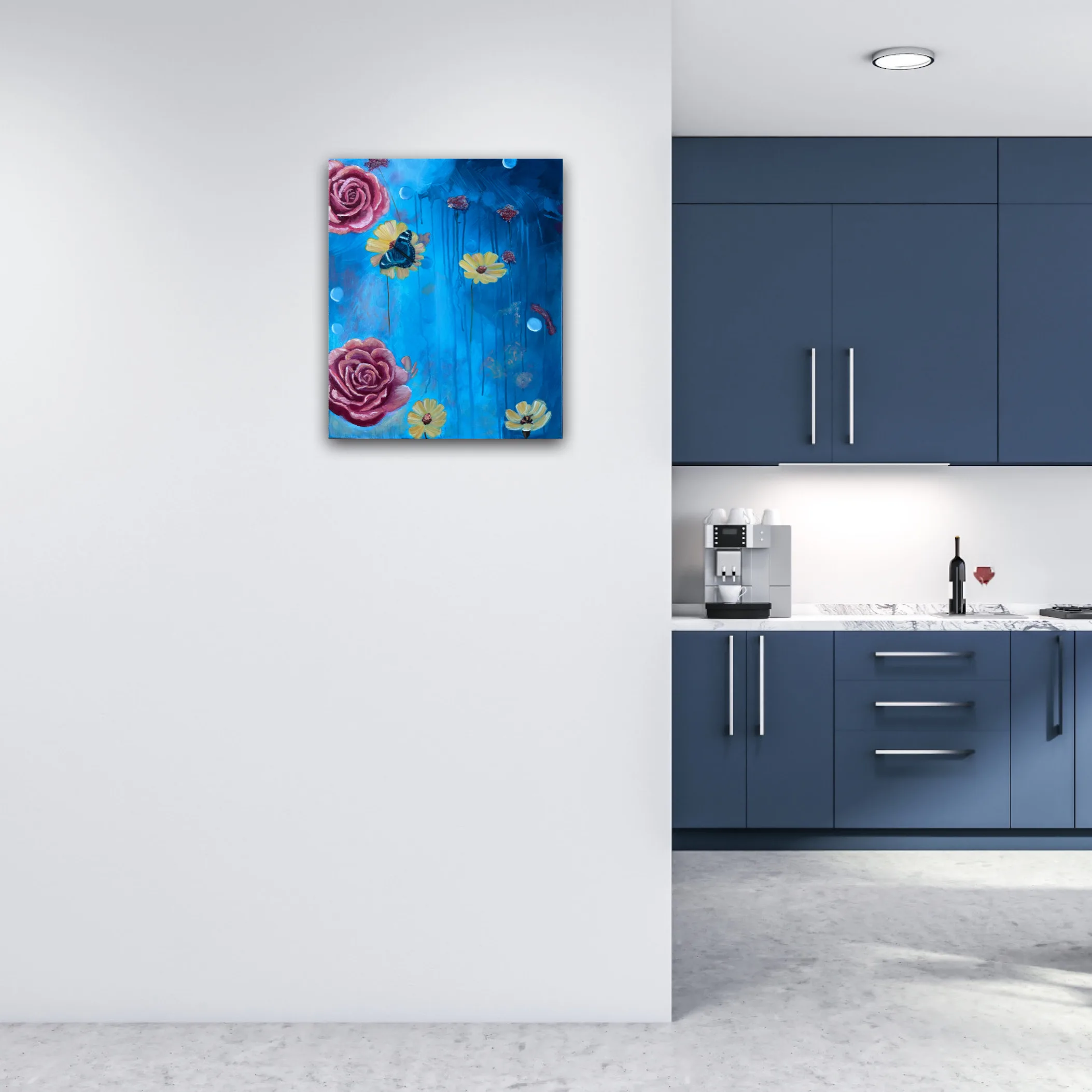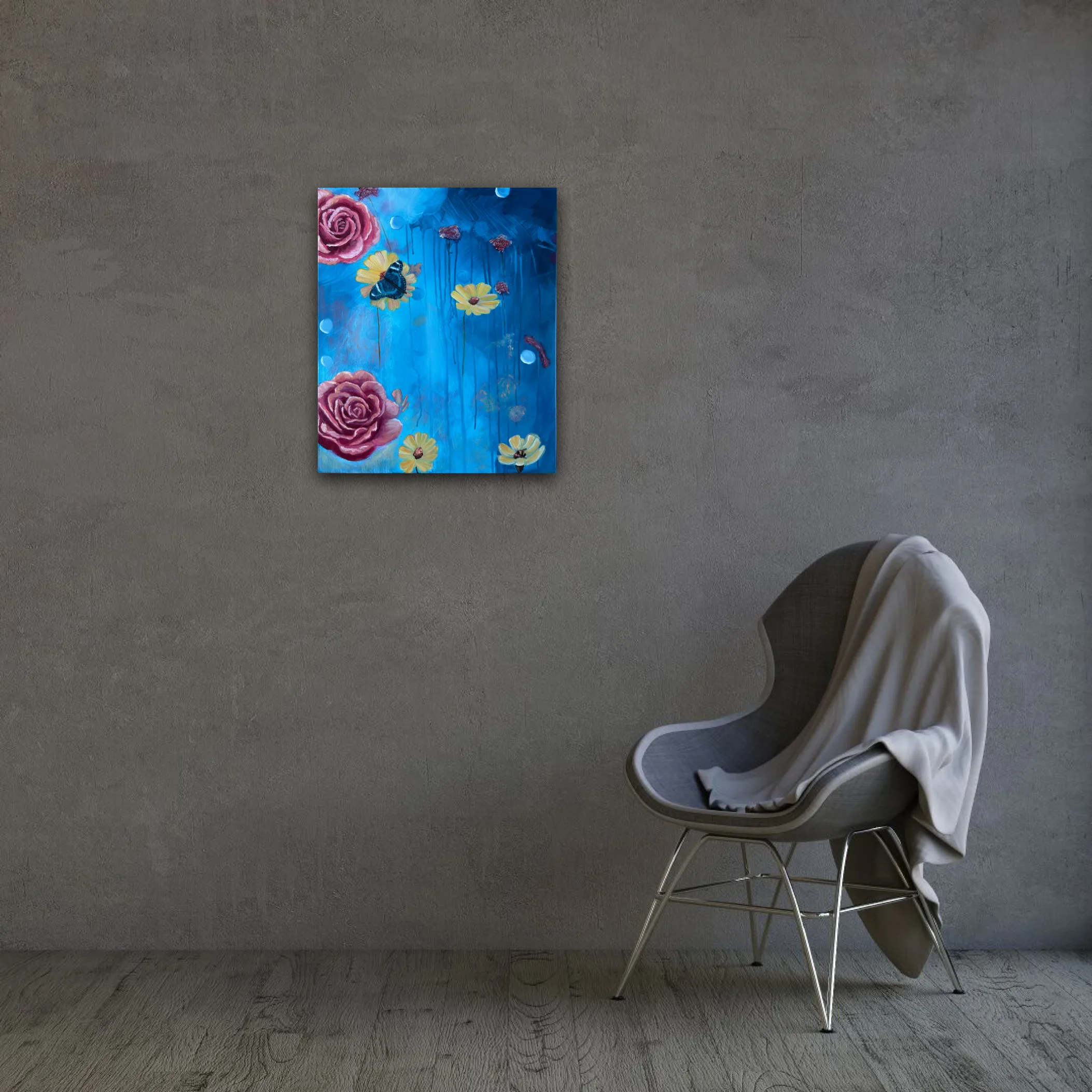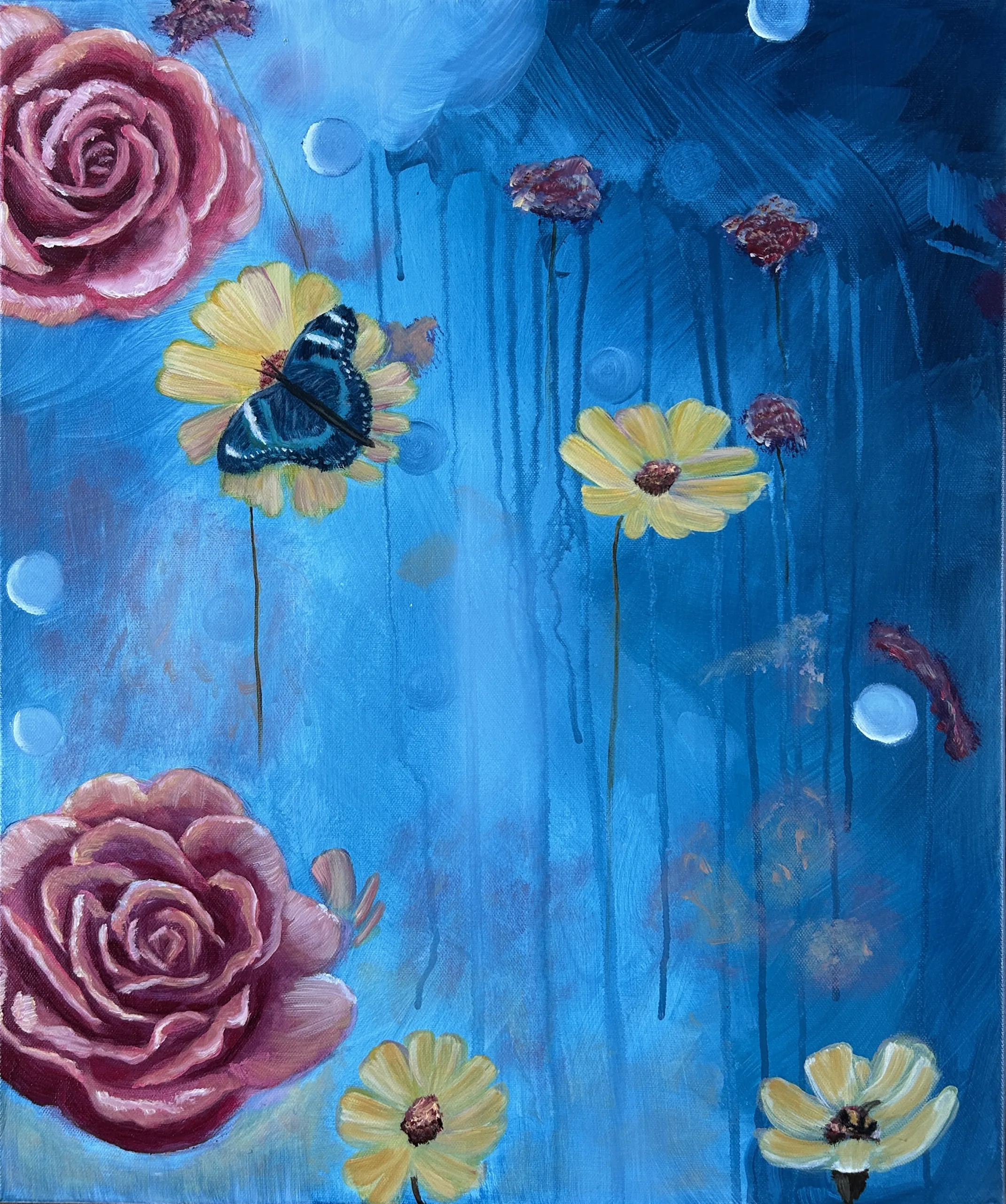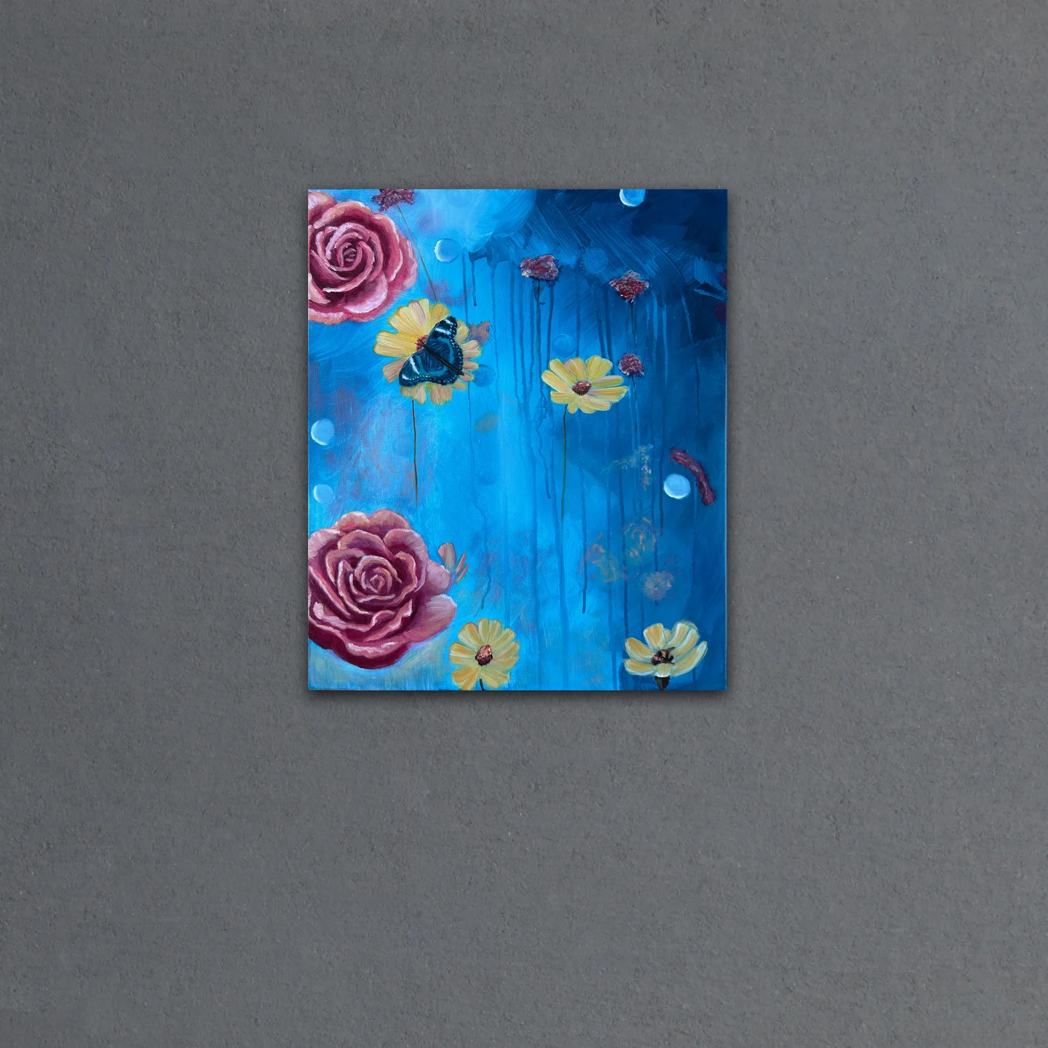 ”I denna drömlika komposition svävar en fjäril vars vingar speglar himlens djupa blå toner. Den har landat försiktigt på en solgul blomma, som om den vilar en stund i evighetens ögonblick. Omkring den dansar rosor och blommor, några tydliga, andra nästan upplösta i bakgrunden – som om de svävar mellan dröm och verklighet.
