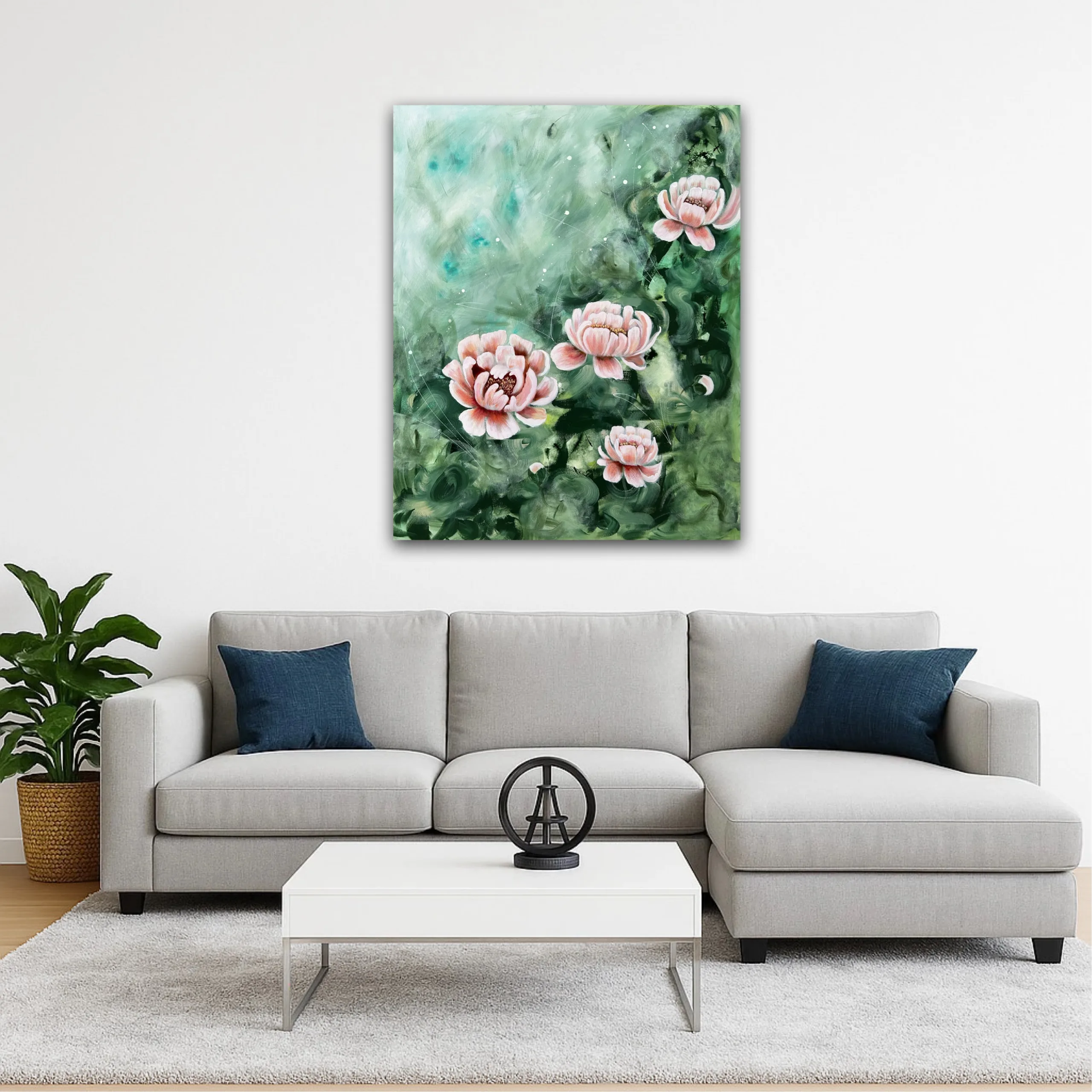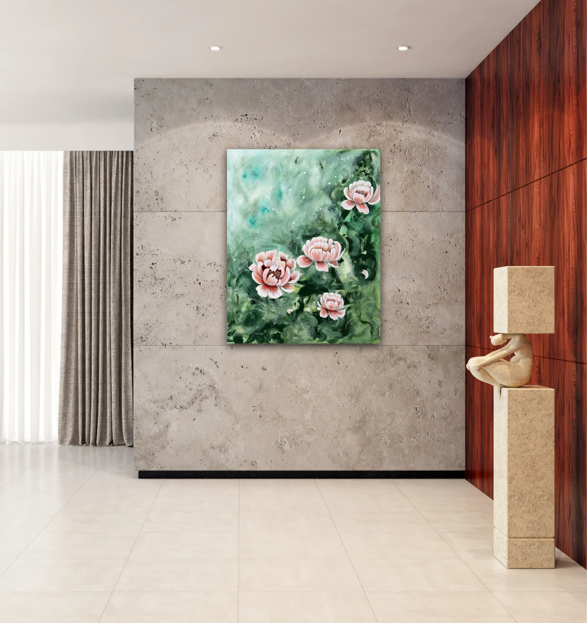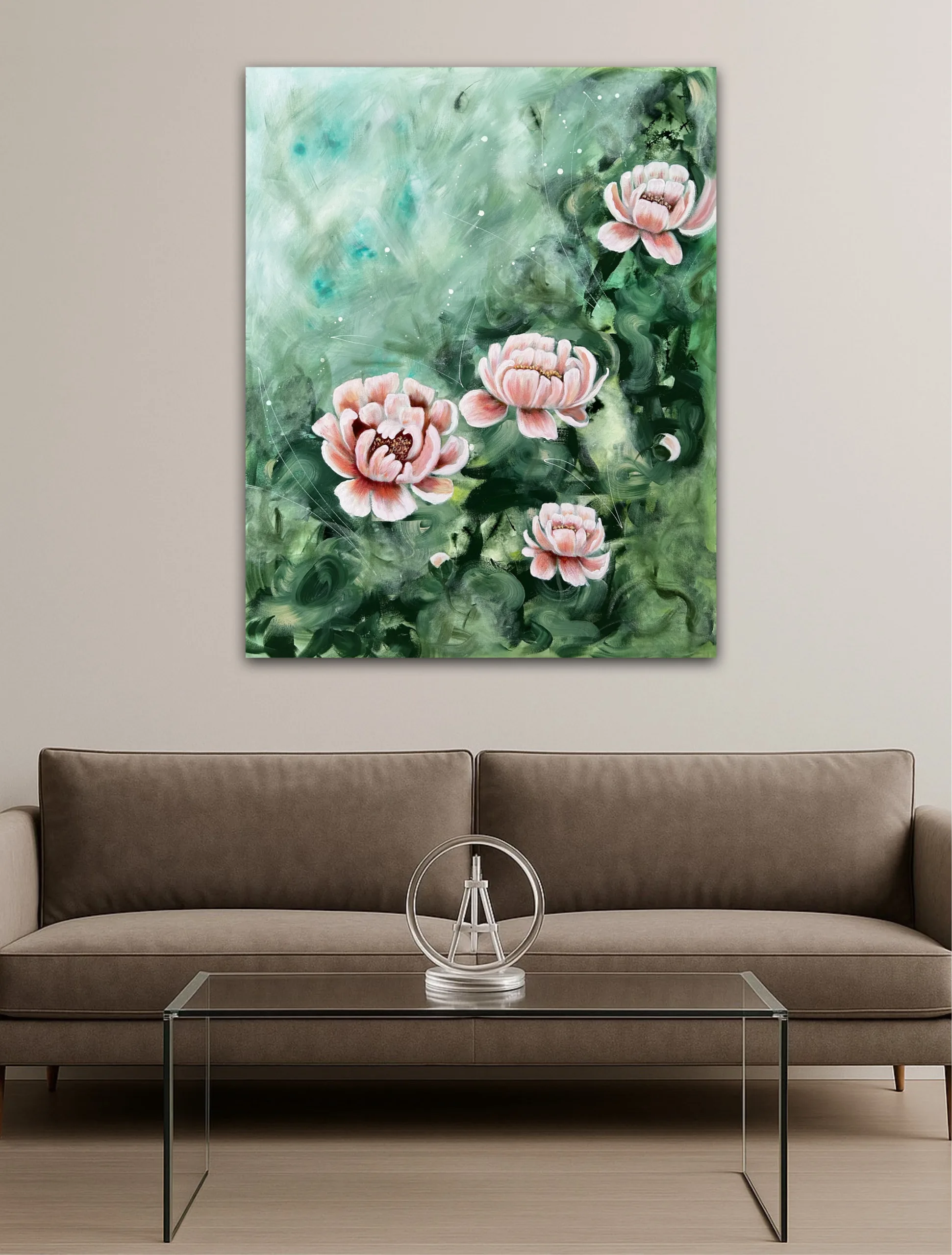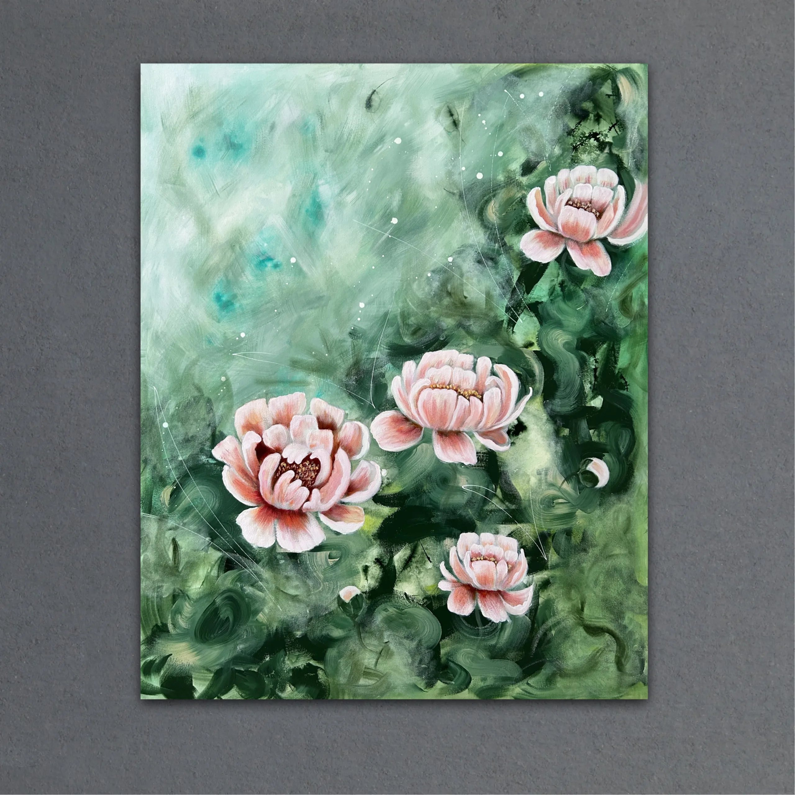 De mjuka nyanserna av grönt omsluter blommorna som en dröm, och kronbladen öppnar sig mot ljuset som om de bär på en hemlig längtan. Det är en målning om stillhet, om livets rytm under ytan – och om skönheten i att bara vara.