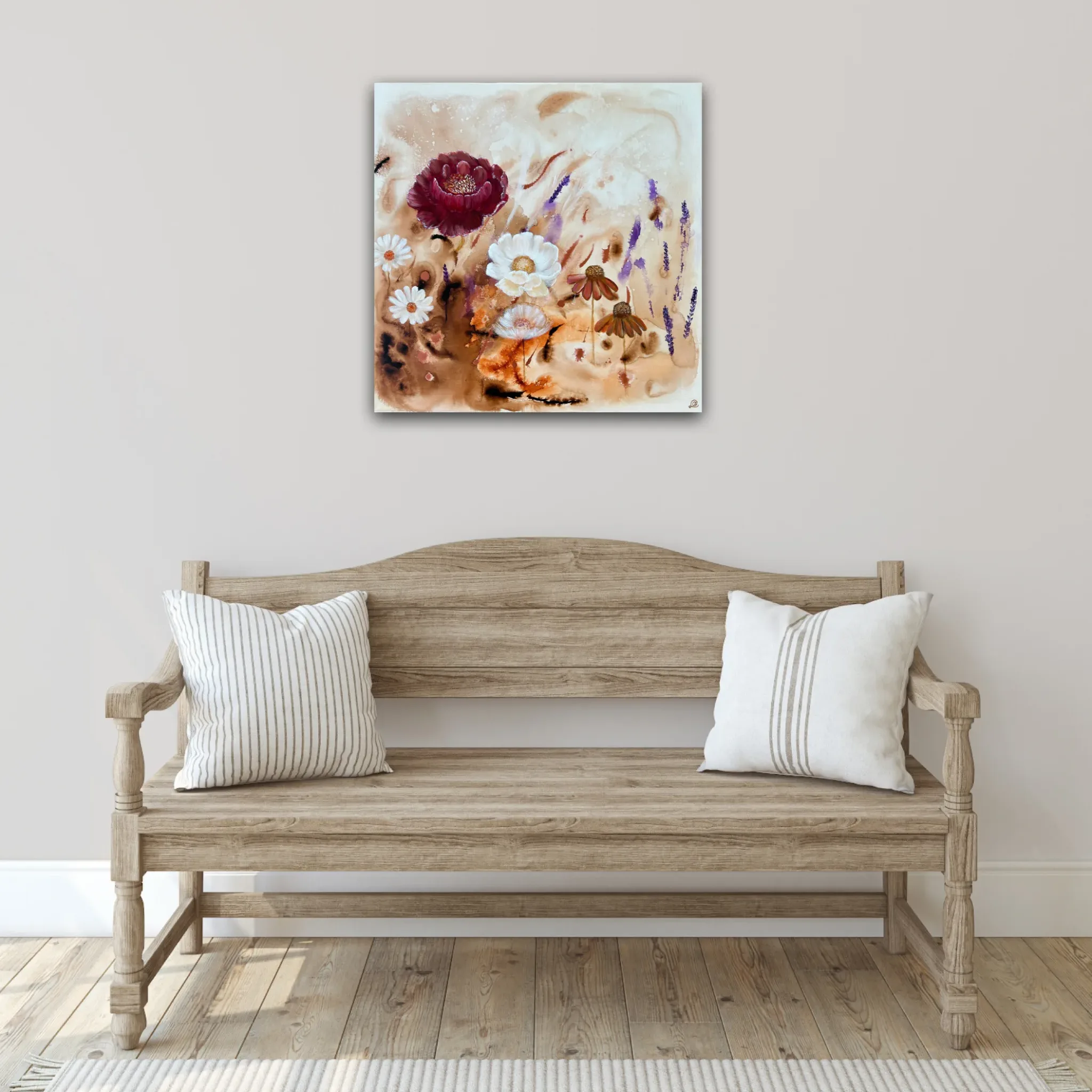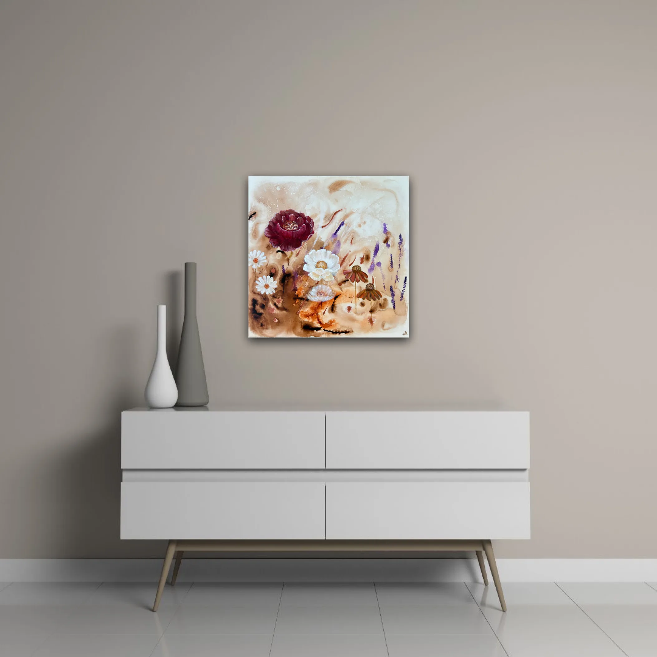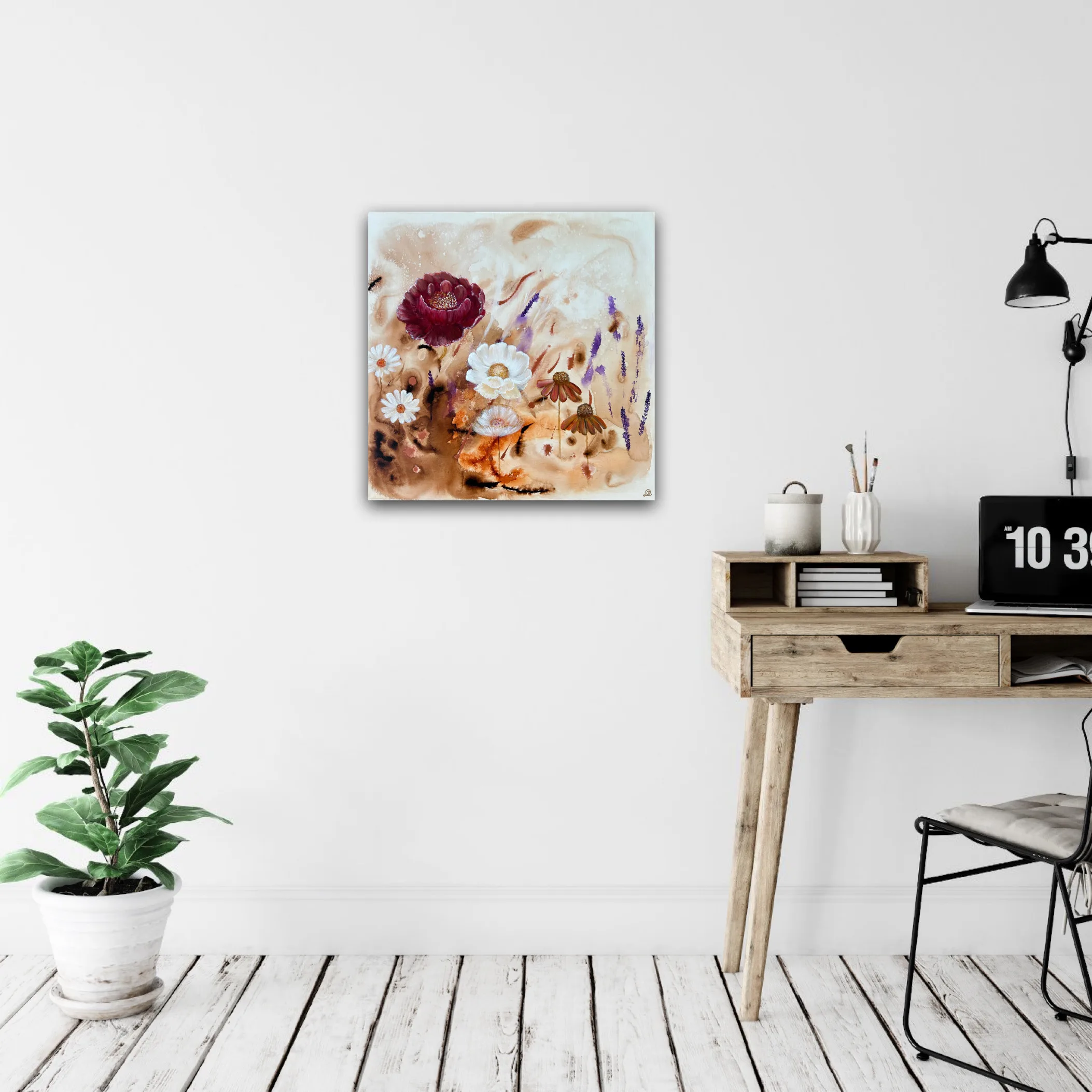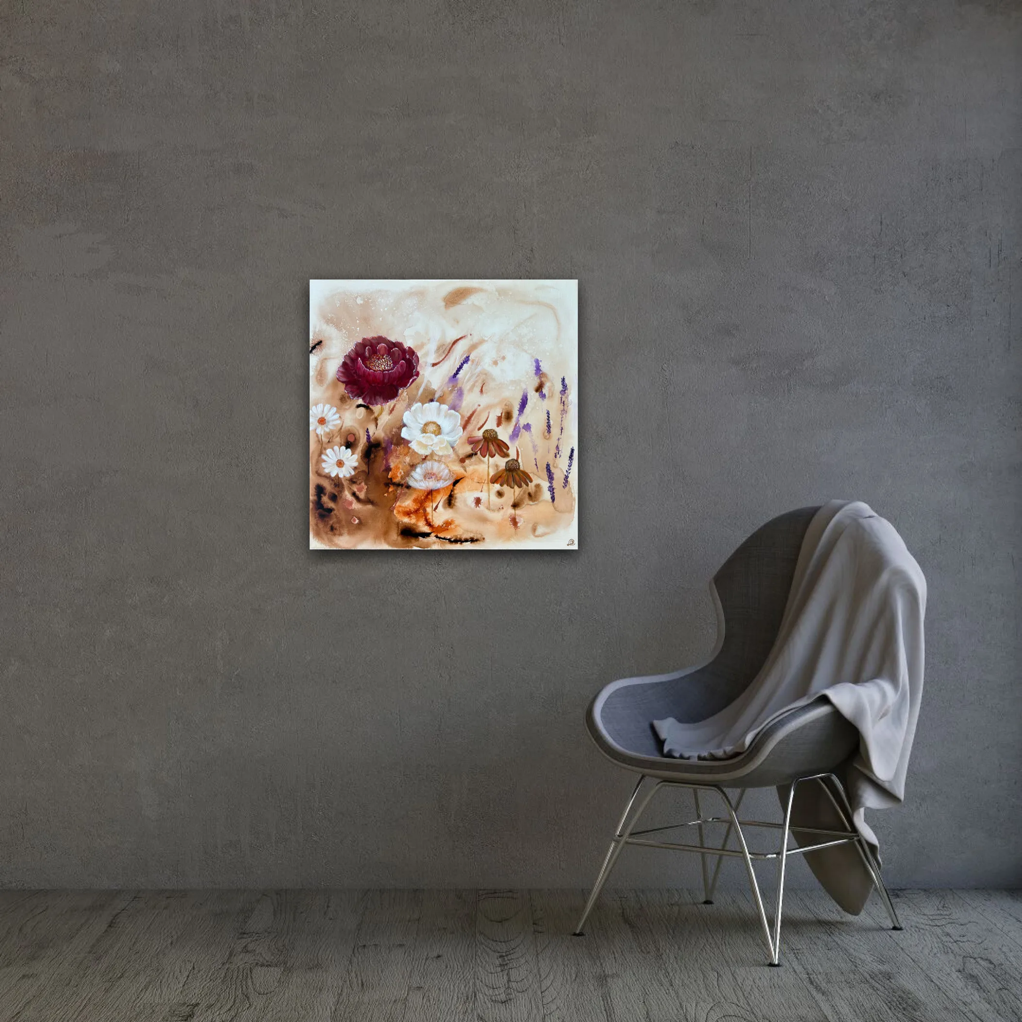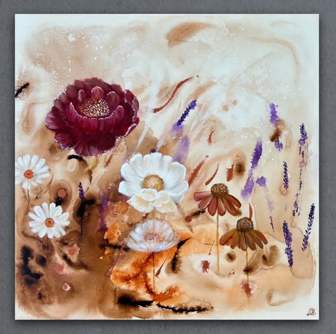 I denna målning känns jorden levande – som om den andas långsamt under ytan, varm av sol, tung av regn, rik av tid. Blommorna har vuxit fram som viskningar ur marken, som om varje kronblad bär på ett minne, ett andetag, en sång från förr.