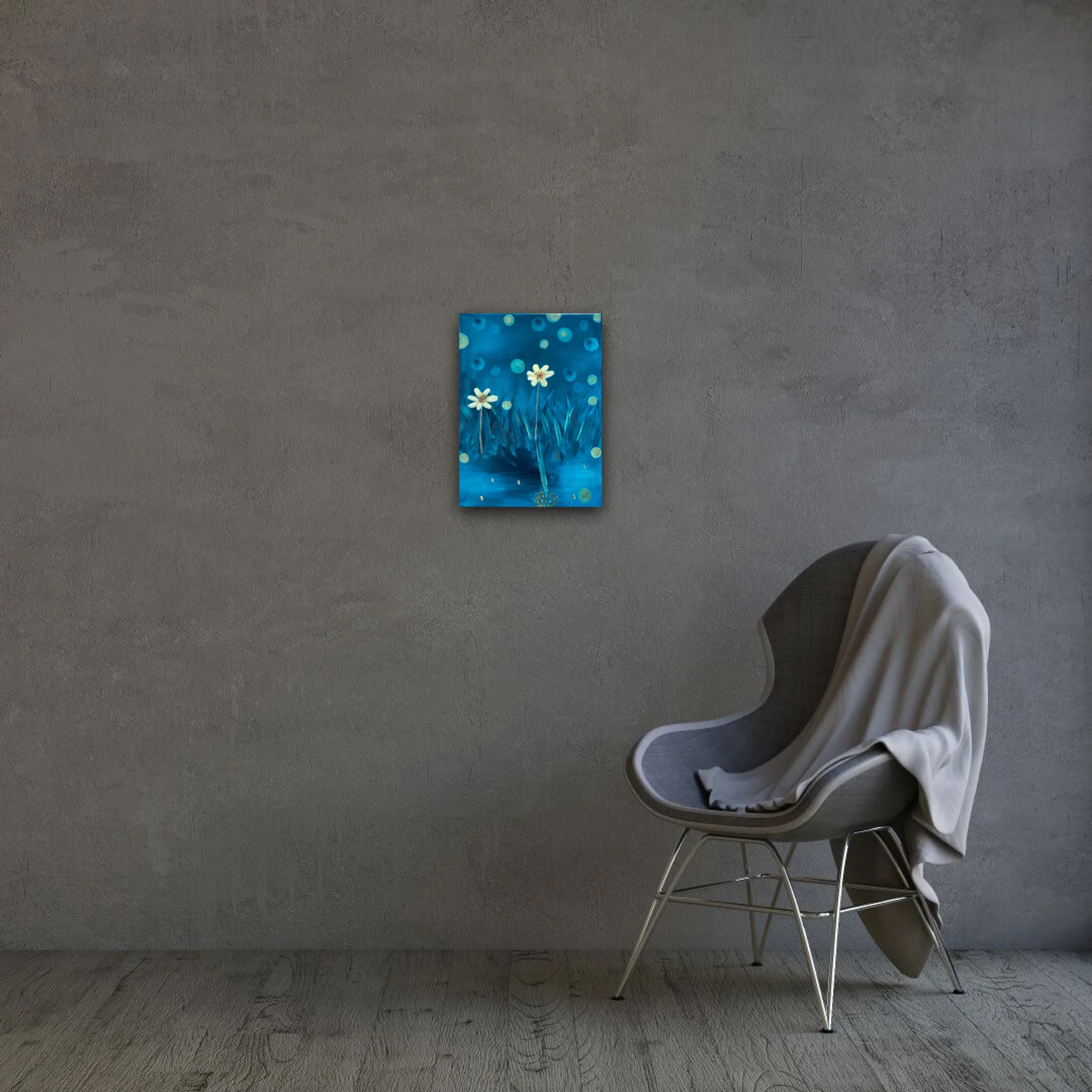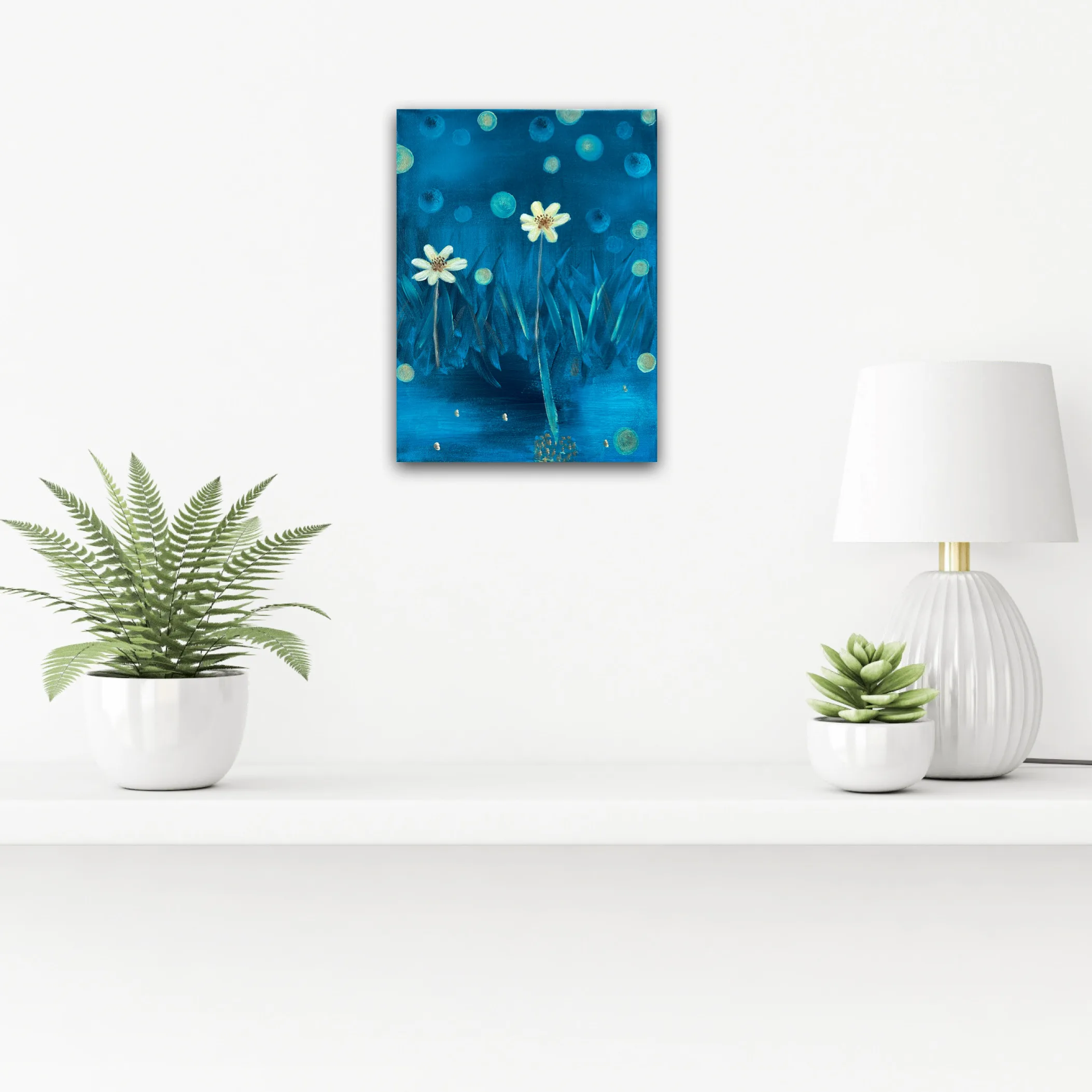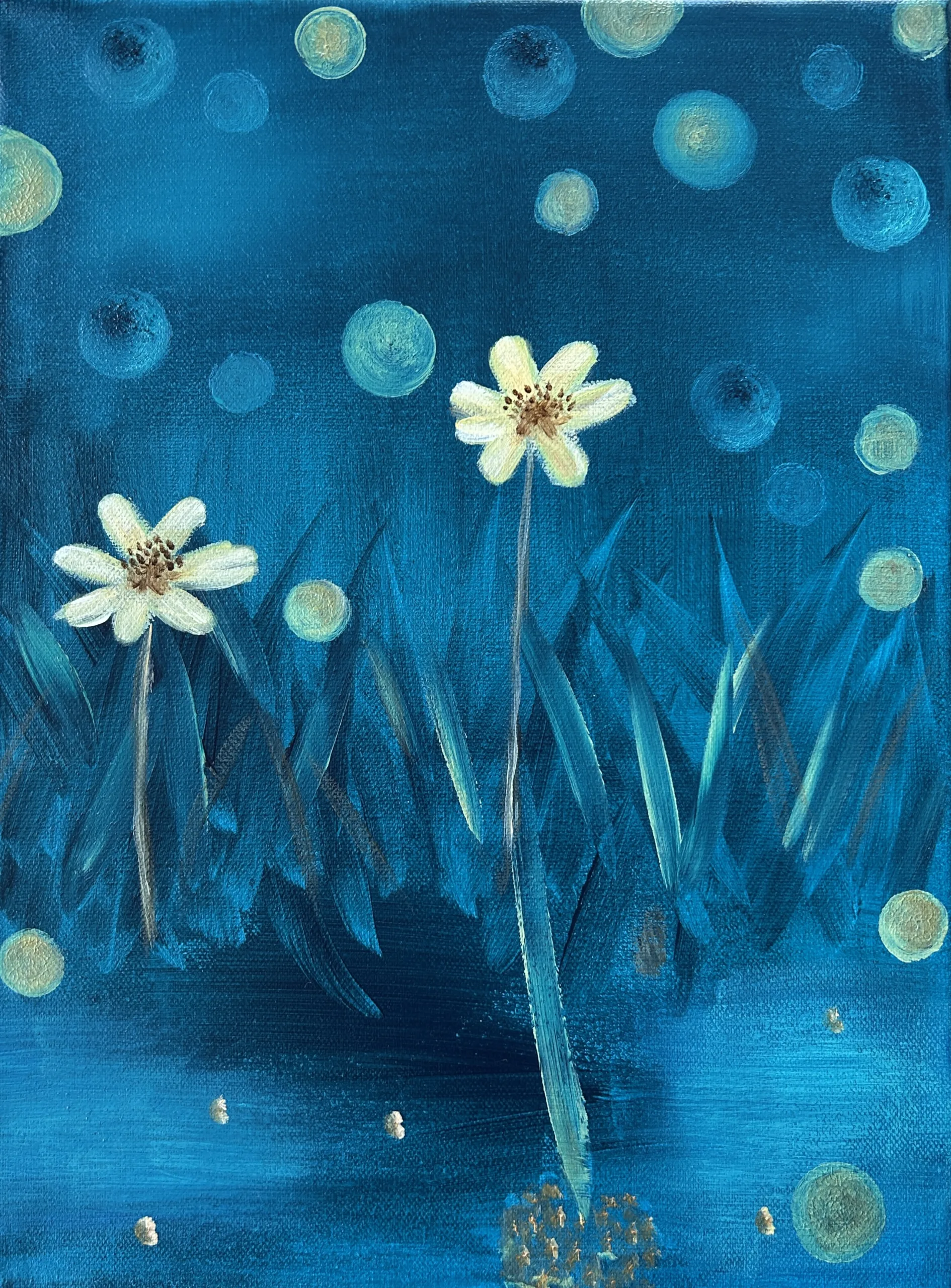 ”Under kvällens djupa blå täcke reser sig blommorna mot himlen, som om de längtar efter att bli en del av stjärnorna som svävar ovanför dem. Deras kronblad skimrar i det mjuka ljuset, fångar drömmar och sprider hopp i den stilla natten.