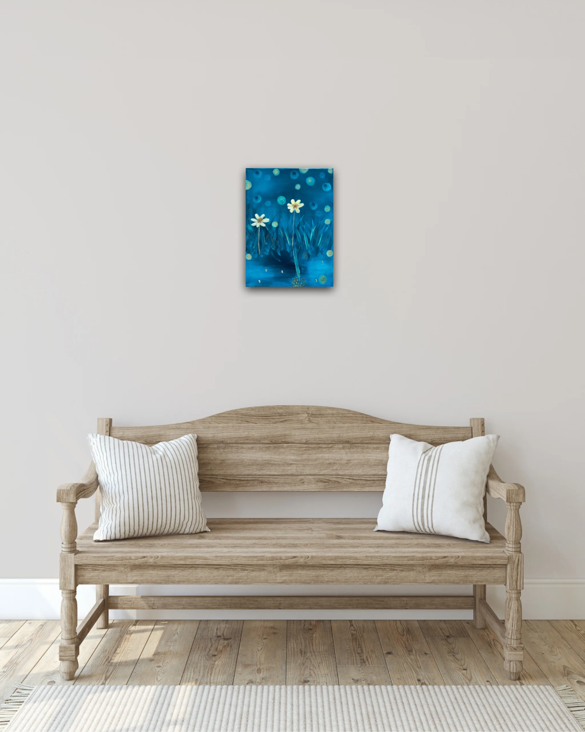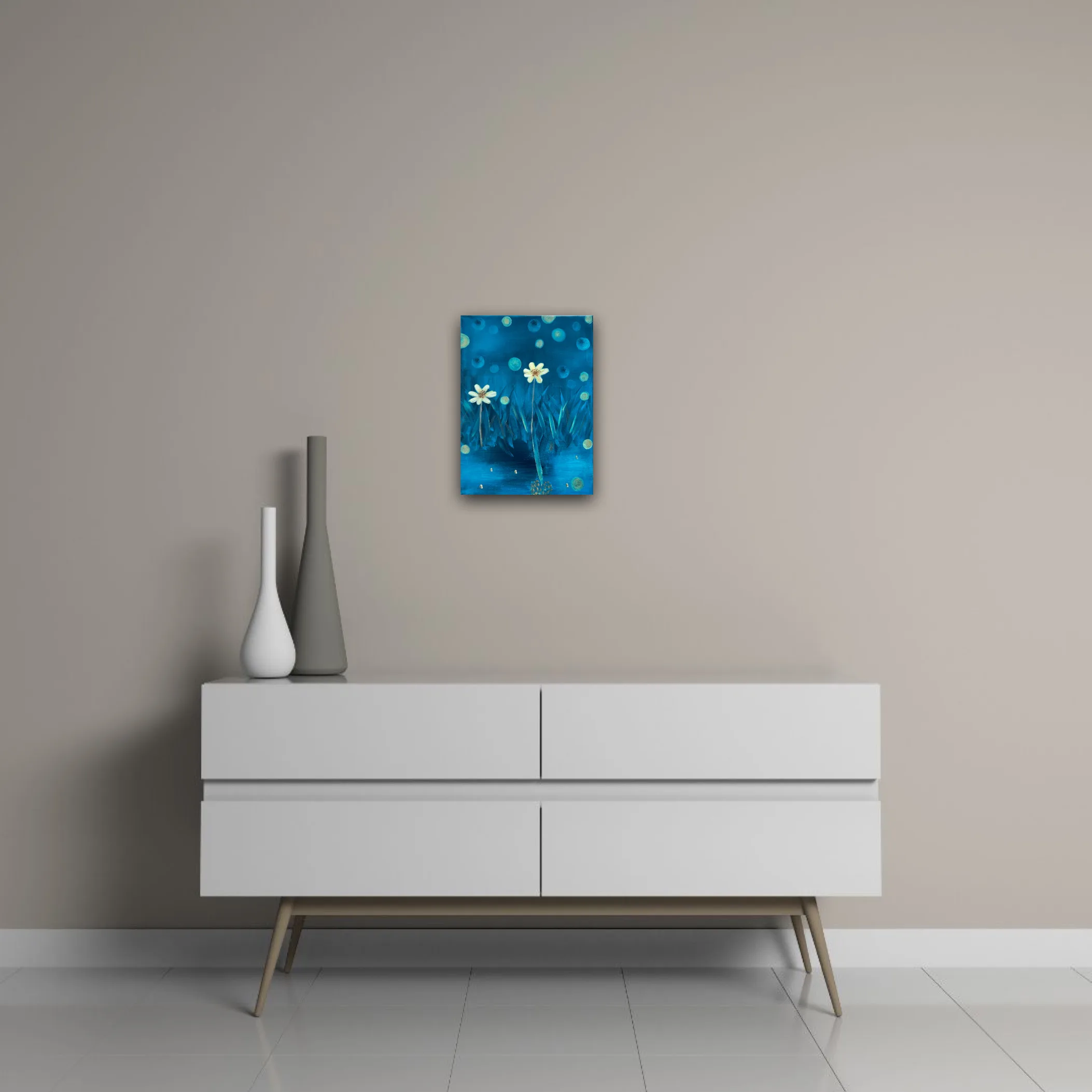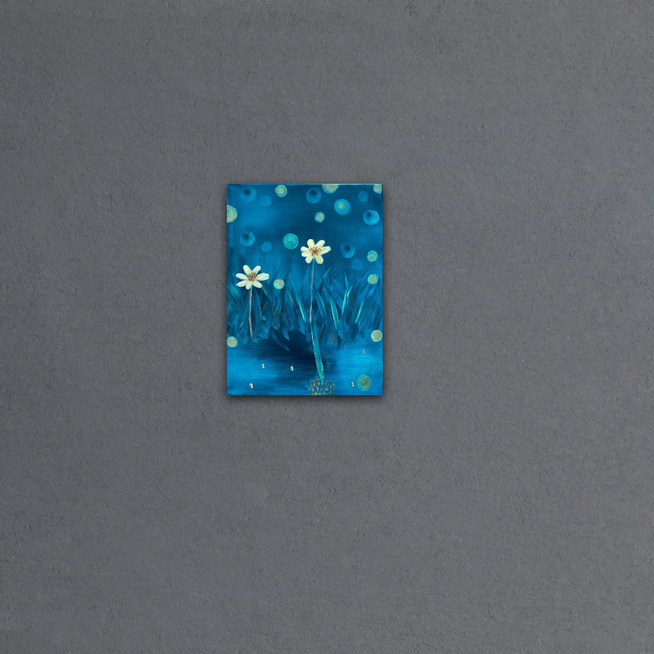 ”Under kvällens djupa blå täcke reser sig blommorna mot himlen, som om de längtar efter att bli en del av stjärnorna som svävar ovanför dem. Deras kronblad skimrar i det mjuka ljuset, fångar drömmar och sprider hopp i den stilla natten.