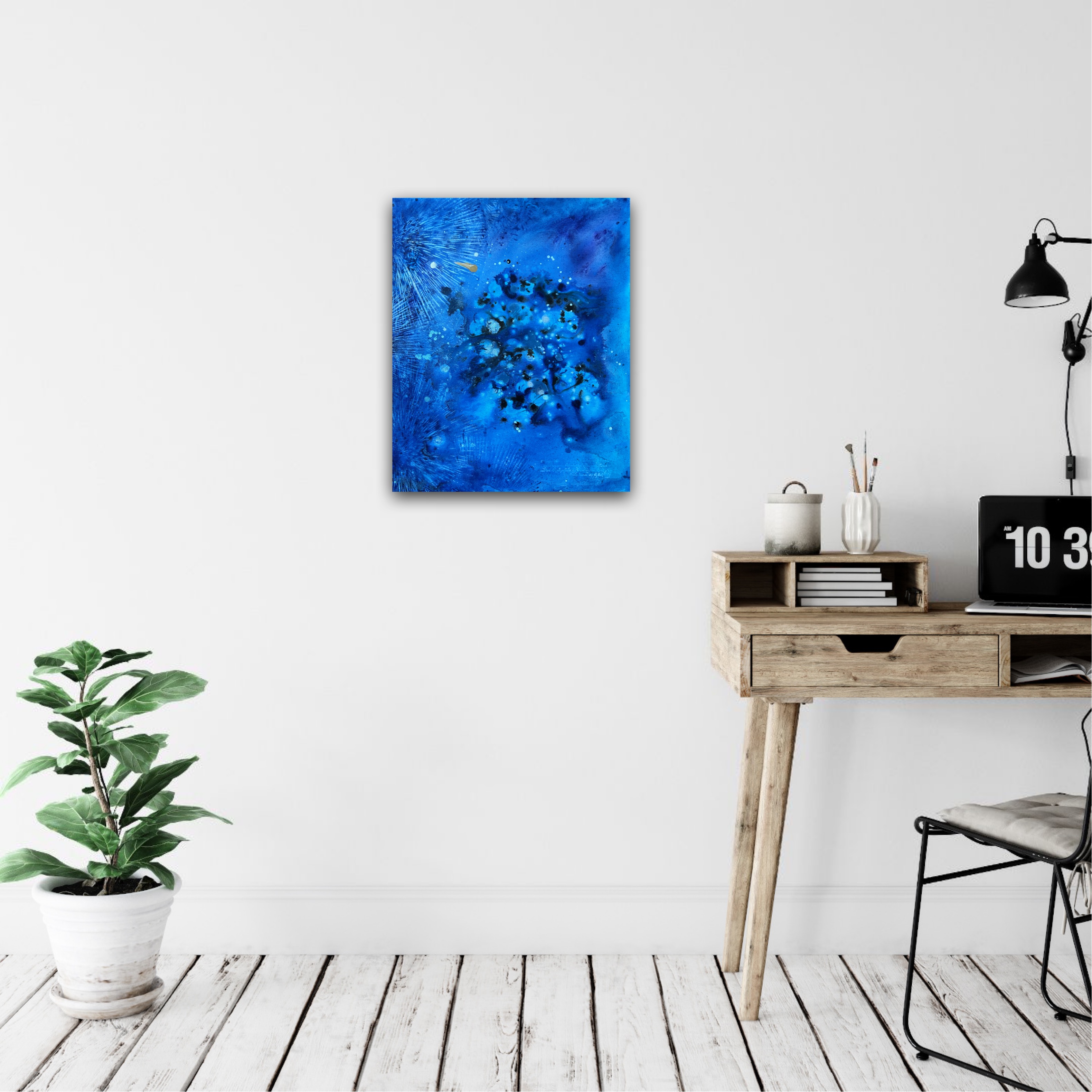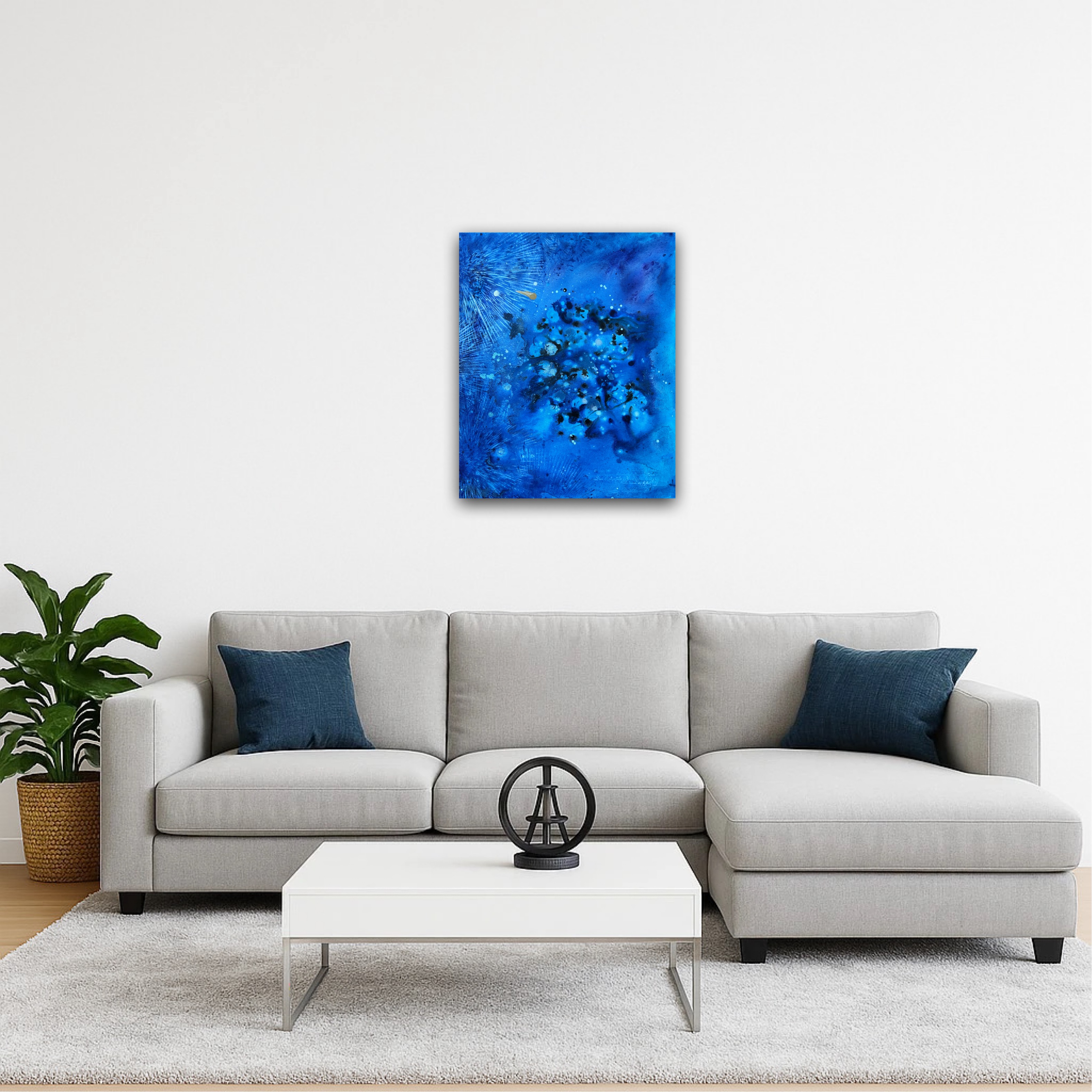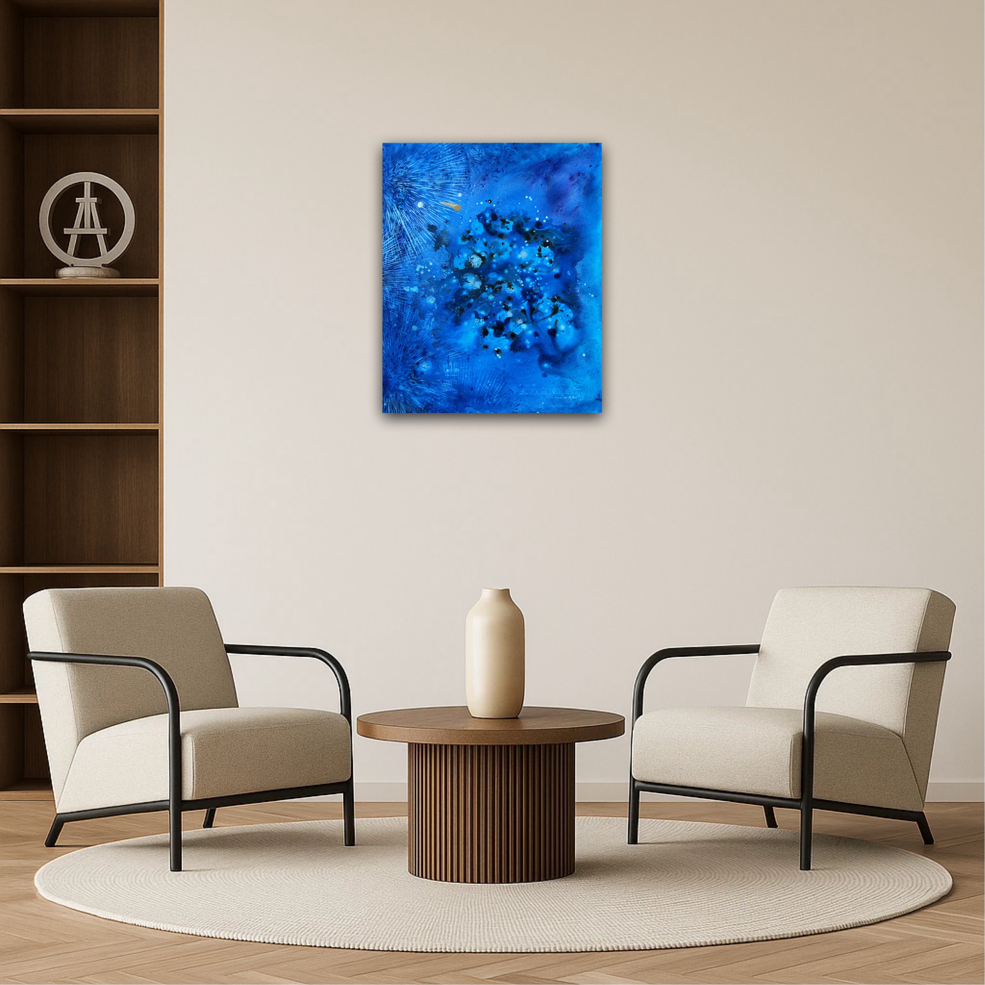 50 x 60 cm ”När stjärnorna minns” är en abstrakt originalmålning i akryl som fångar känslan av stilla natt och tidlös dröm. Ljus och mörker möts i ett mjukt samspel av blå, guldiga och silvertoner – som ett eko av stjärnornas viskningar över tid. Akryl och olja på canvas