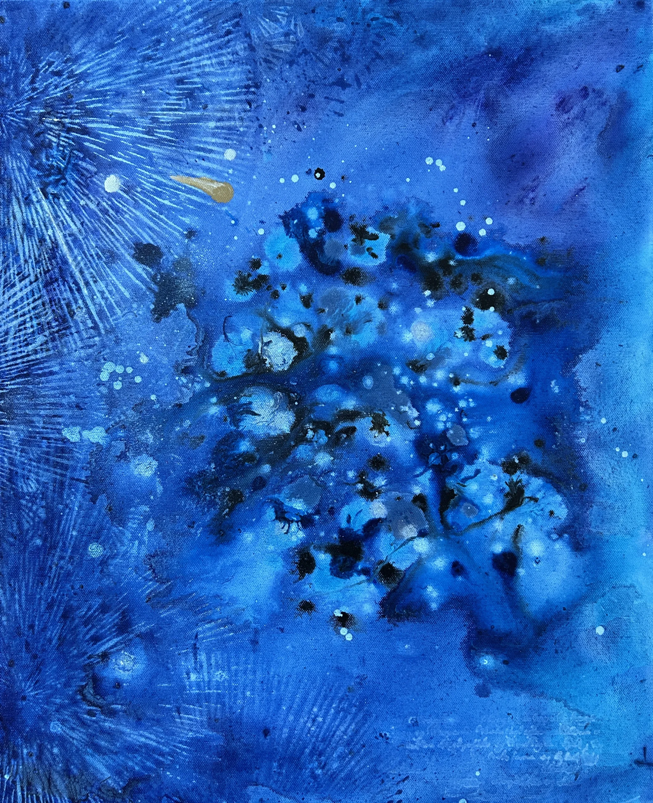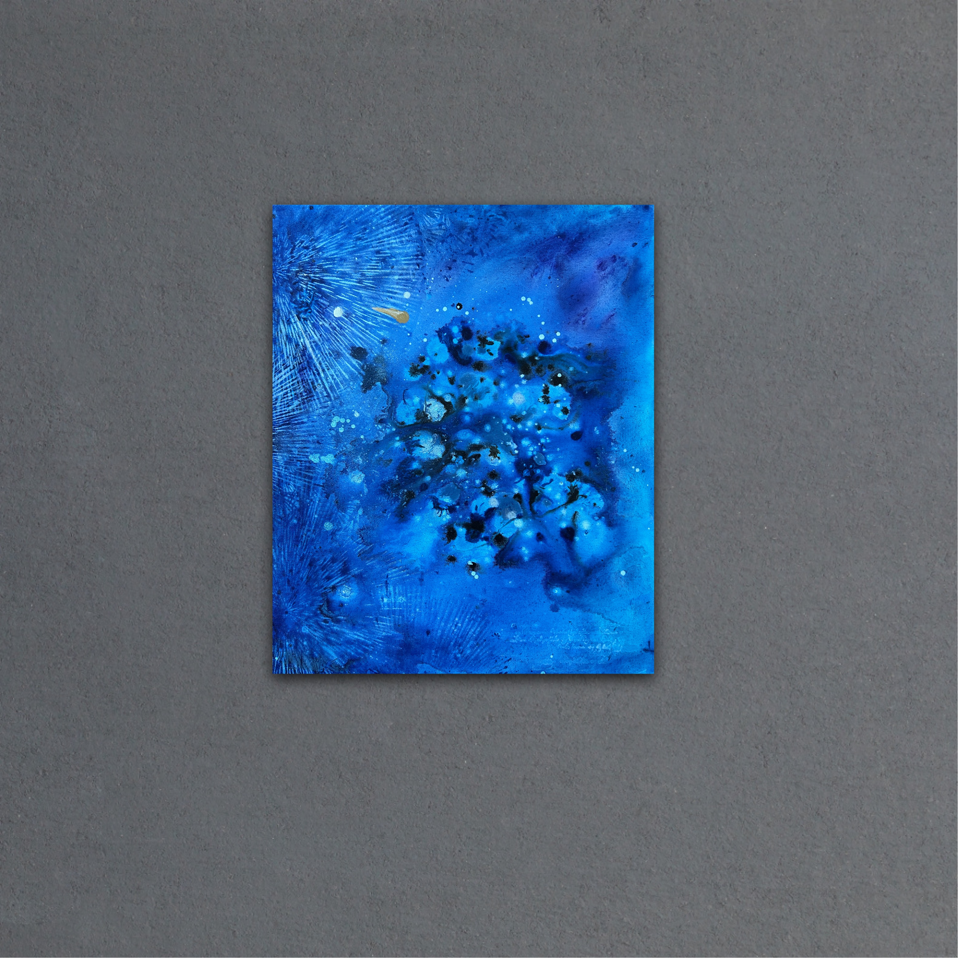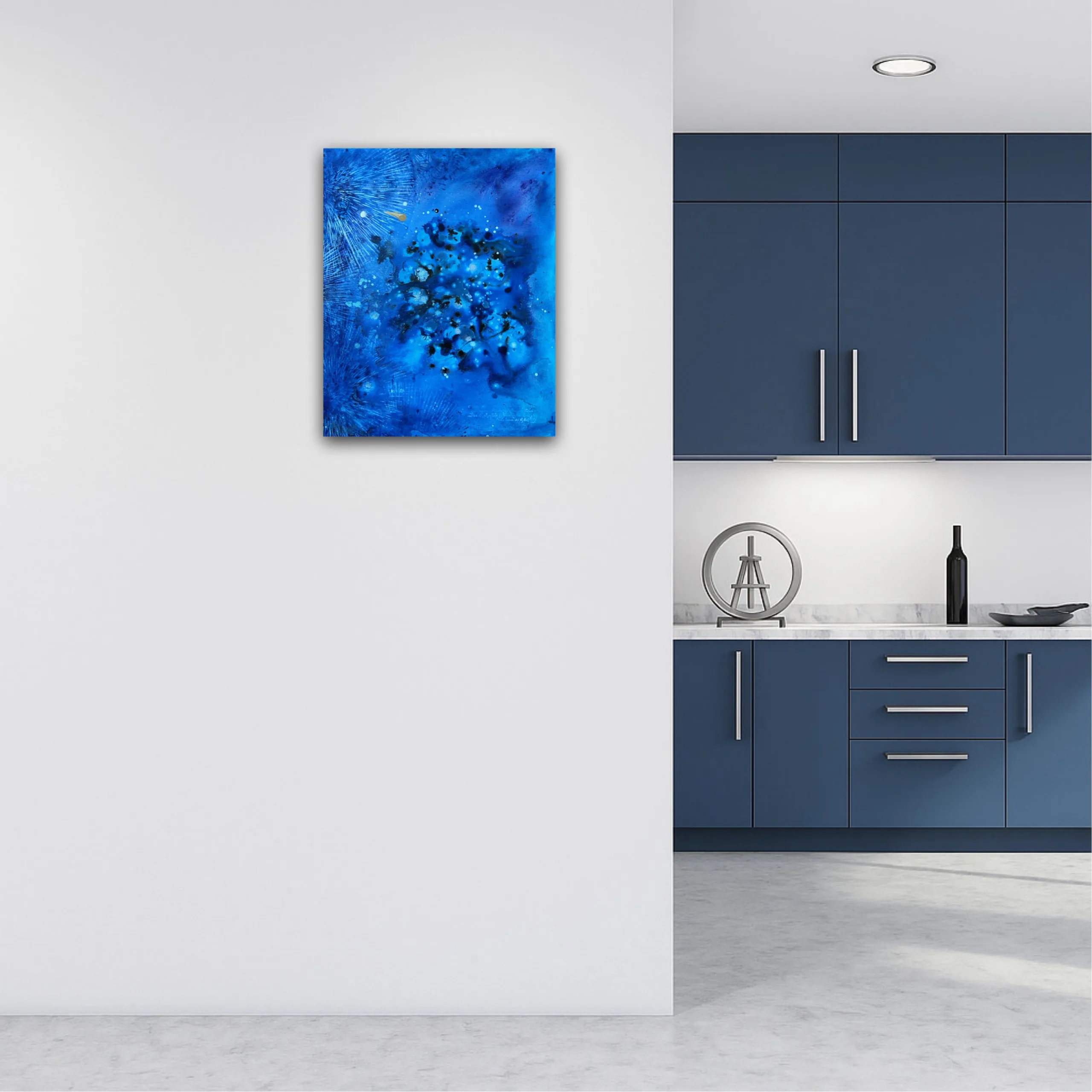 50 x 60 cm ”När stjärnorna minns” är en abstrakt originalmålning i akryl som fångar känslan av stilla natt och tidlös dröm. Ljus och mörker möts i ett mjukt samspel av blå, guldiga och silvertoner – som ett eko av stjärnornas viskningar över tid. Akryl och olja på canvas