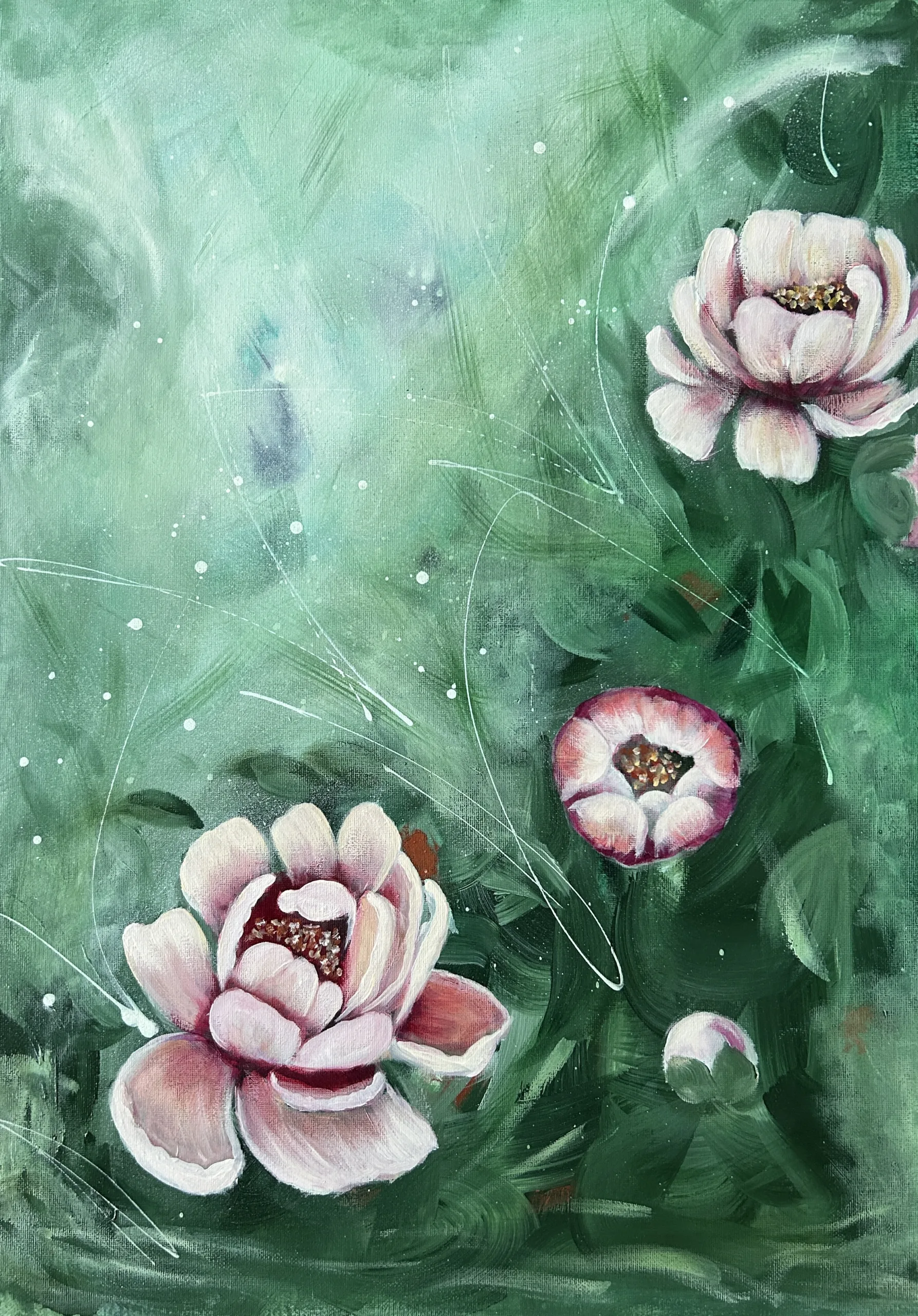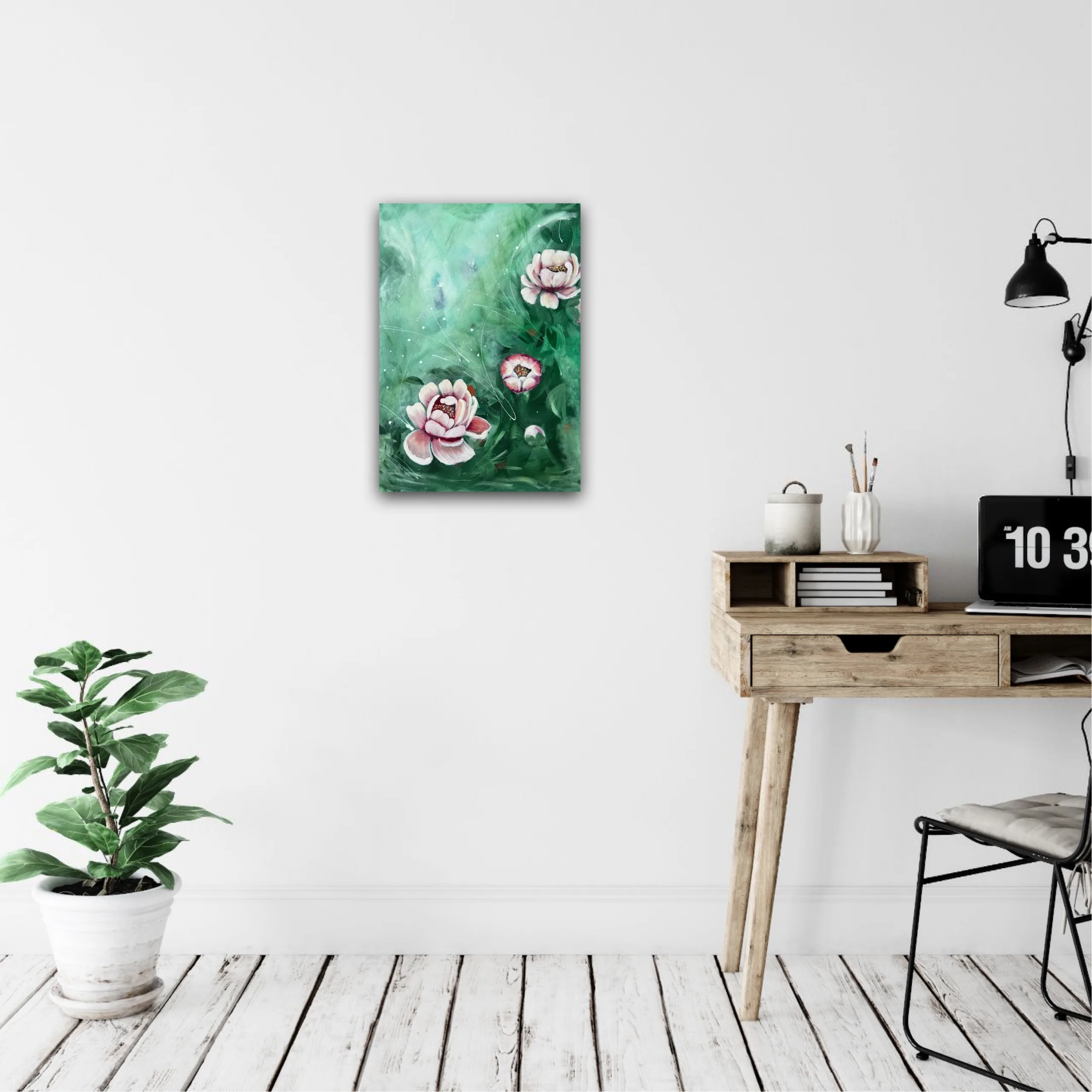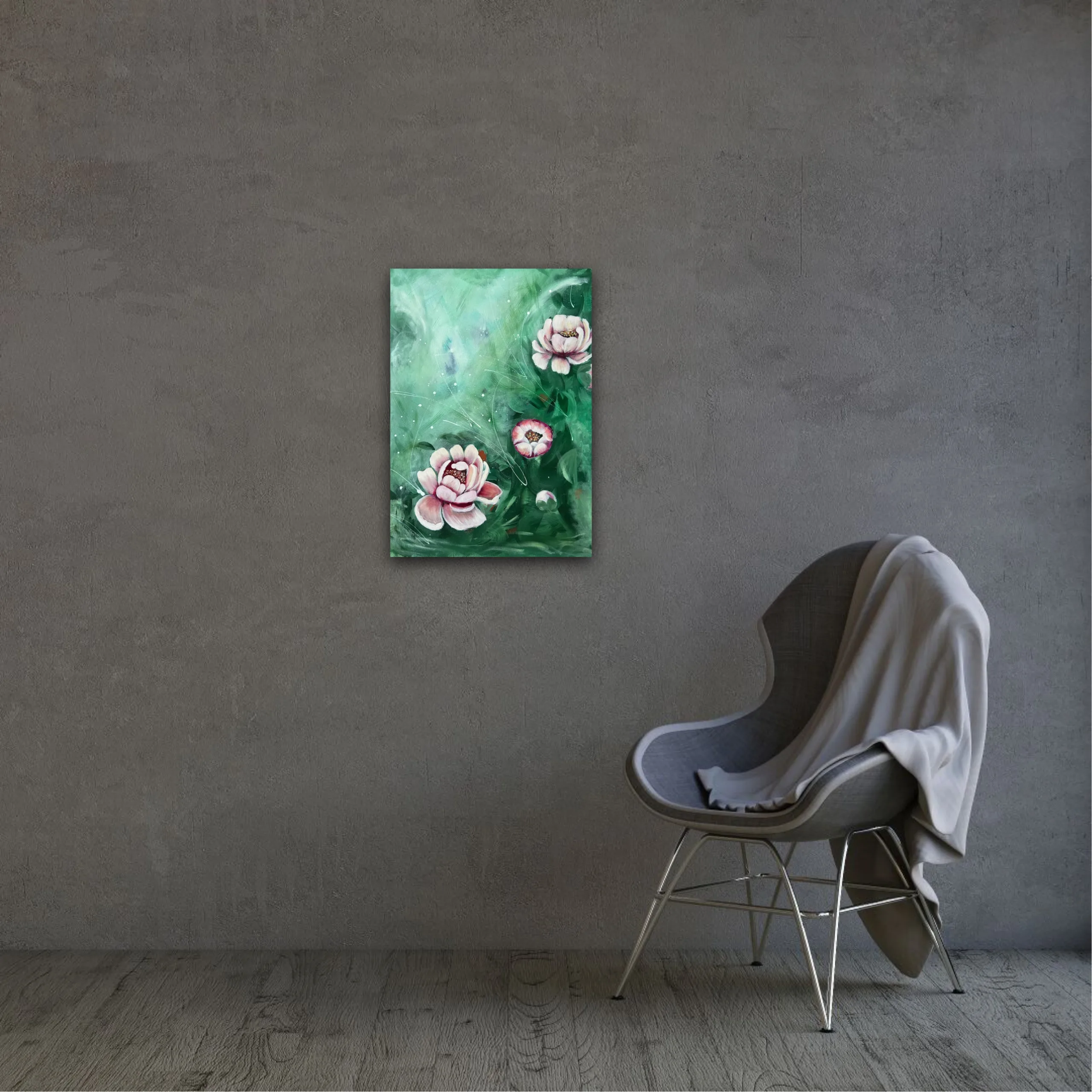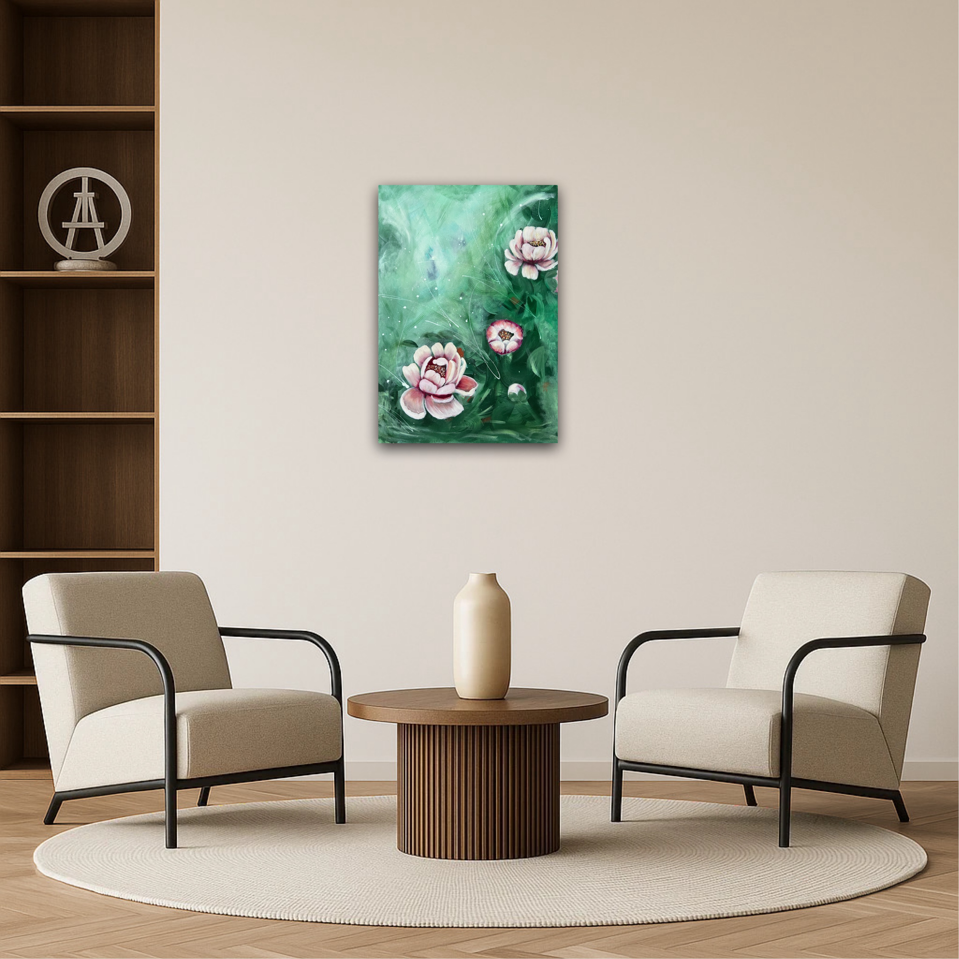 Mjuka blommor breder ut sig i ett grönt hav av ljus. De tycks sväva mellan världar — mellan jord och dröm, mellan nu och evighet. ”Stillhetens dans” fångar det ögonblick där naturen håller andan, innan vinden rör sig, innan dagen vaknar.