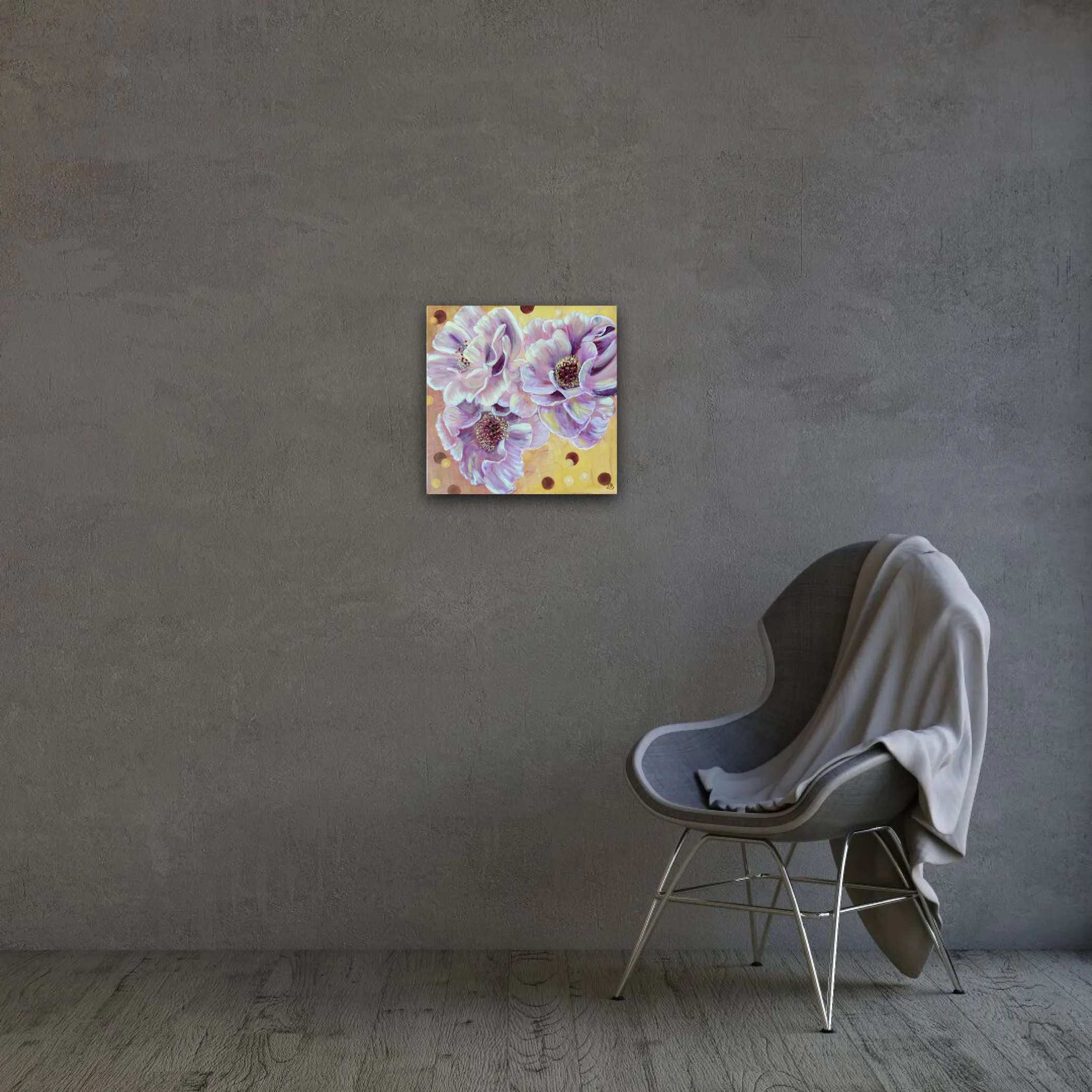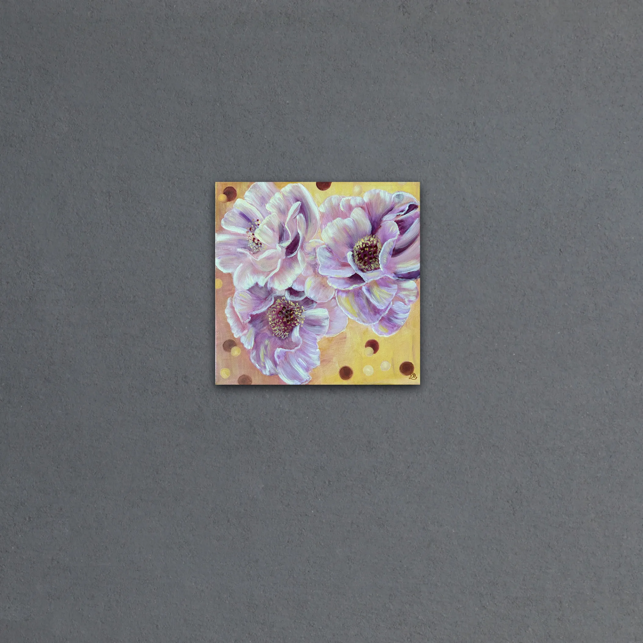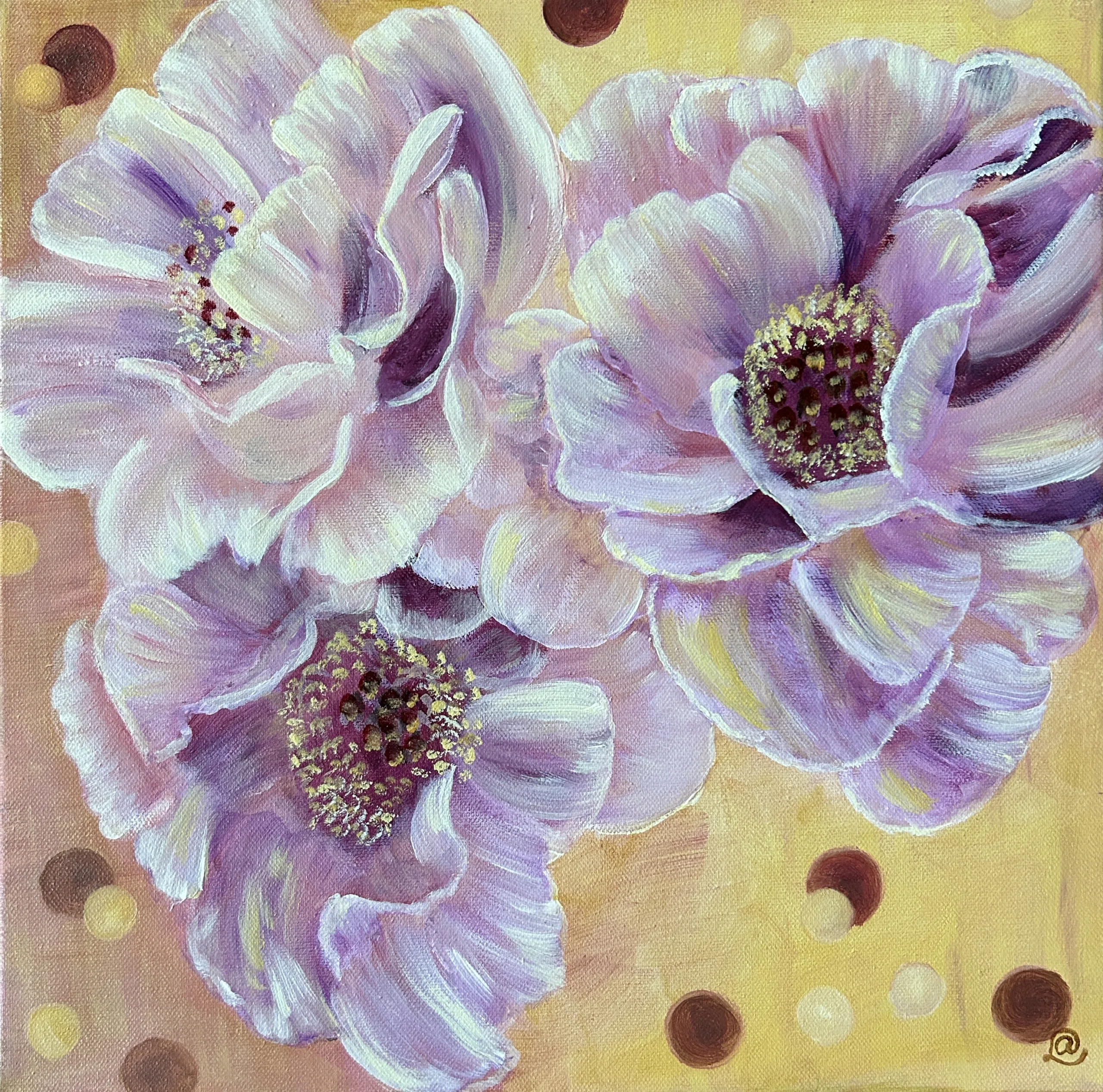 ”Tre blommor i samklang, sammanflätade som tre själar i en evig dans. ”Tidlös Harmoni” är en berättelse om gemenskap, skönhet och naturens rytm. Färgerna rör sig mellan djupa lila toner och mjuka rosa nyanser, med gyllene accenter som förstärker känslan av värme och ljus. Tavlan andas balans och elegans – en hyllning till livets skörhet och styrka, där varje blomma bär sin egen unika historia.” – Ann-Sofie Lycke