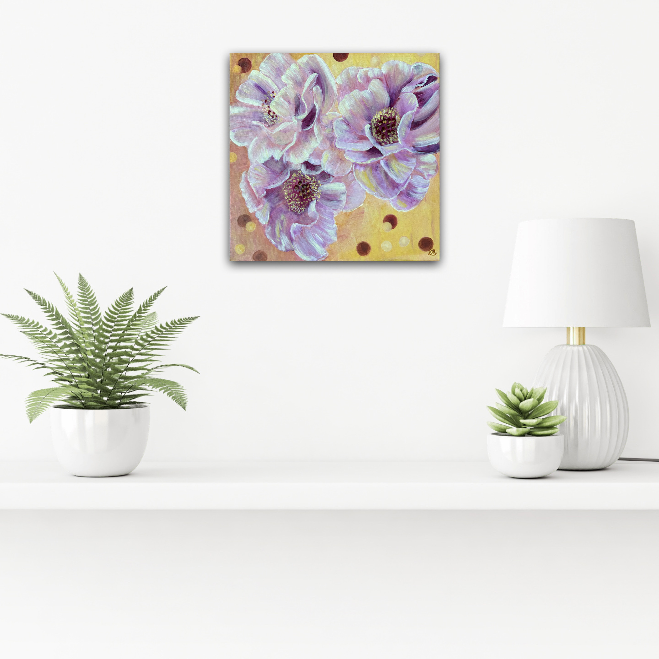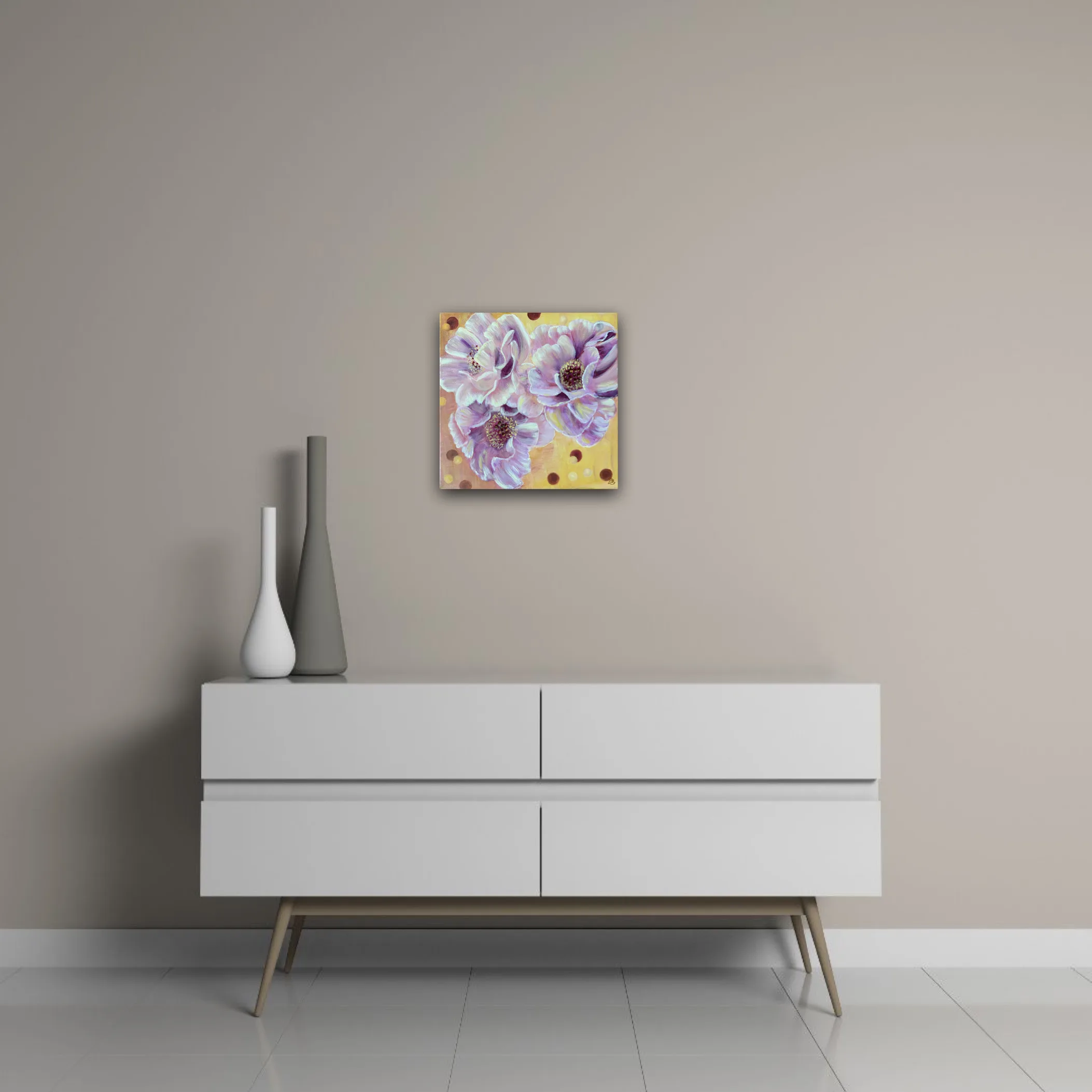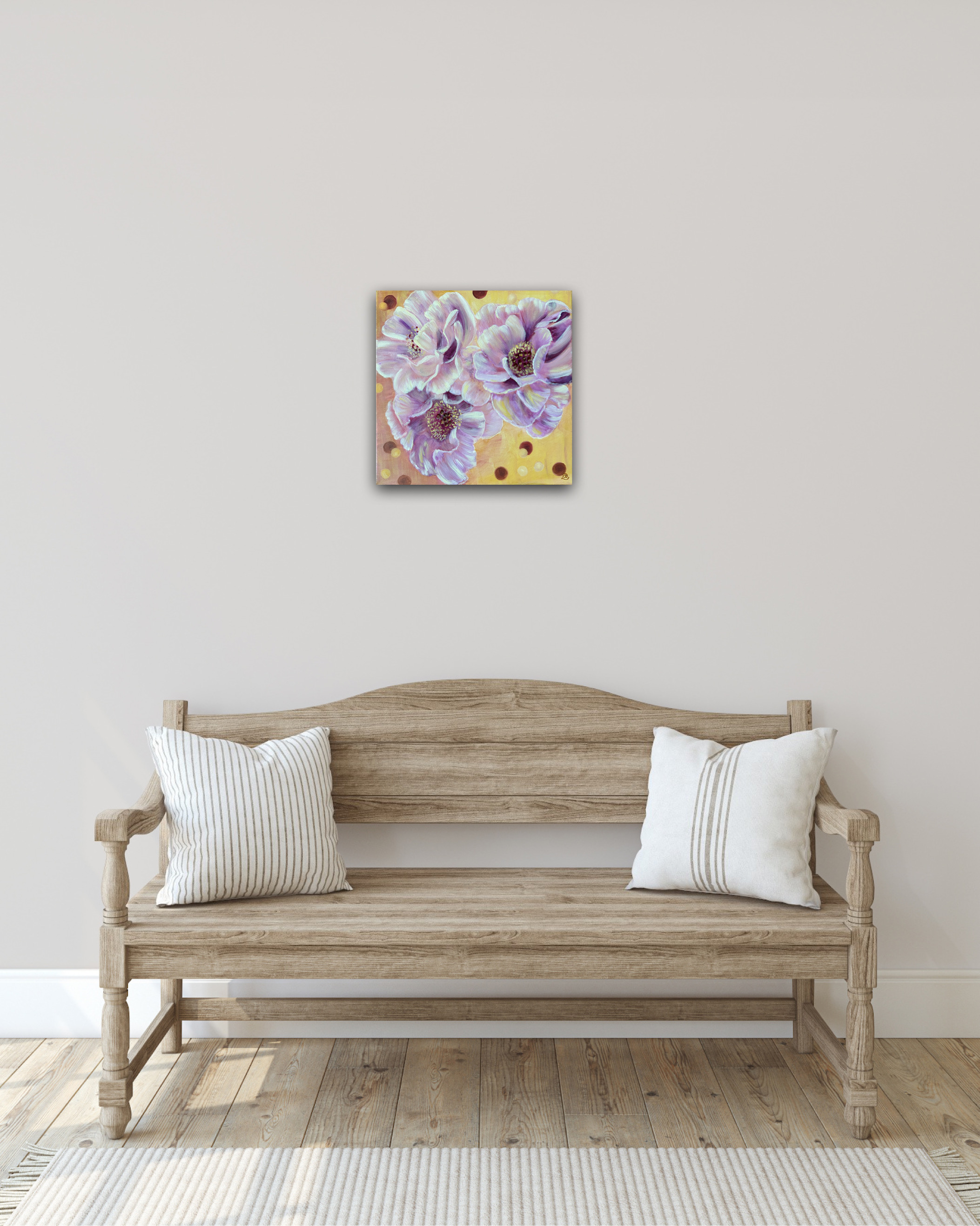 ”Tre blommor i samklang, sammanflätade som tre själar i en evig dans. ”Tidlös Harmoni” är en berättelse om gemenskap, skönhet och naturens rytm. Färgerna rör sig mellan djupa lila toner och mjuka rosa nyanser, med gyllene accenter som förstärker känslan av värme och ljus. Tavlan andas balans och elegans – en hyllning till livets skörhet och styrka, där varje blomma bär sin egen unika historia.” – Ann-Sofie Lycke