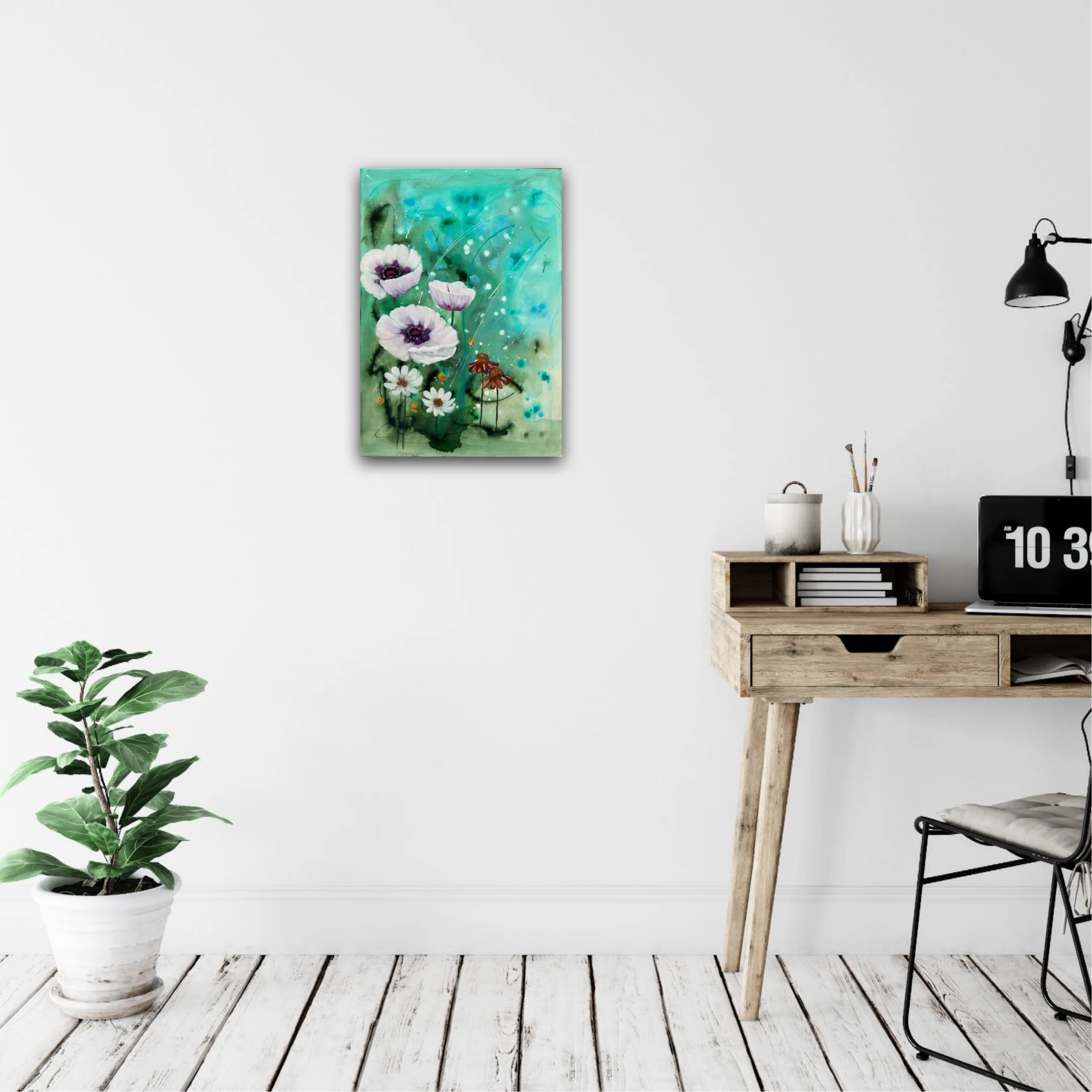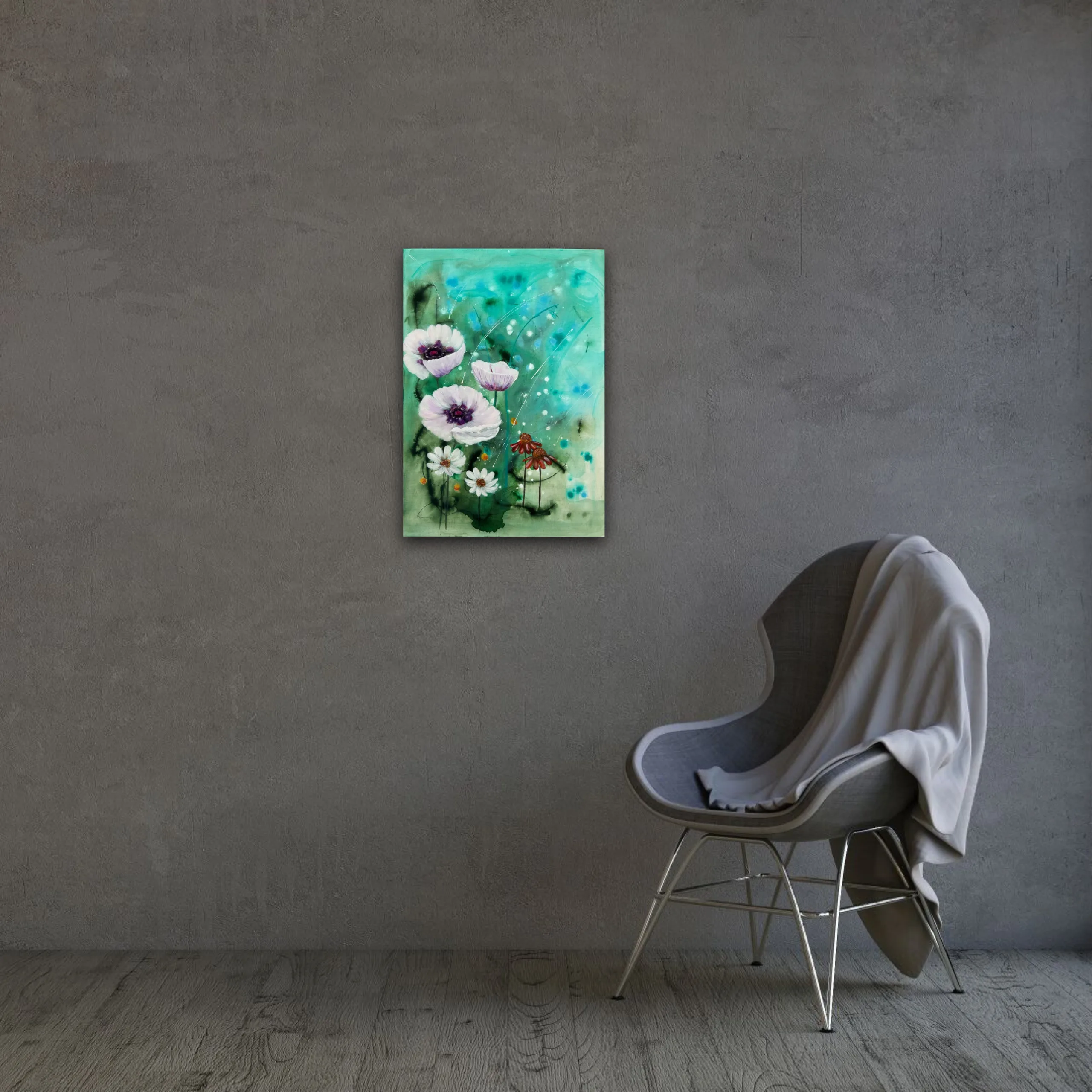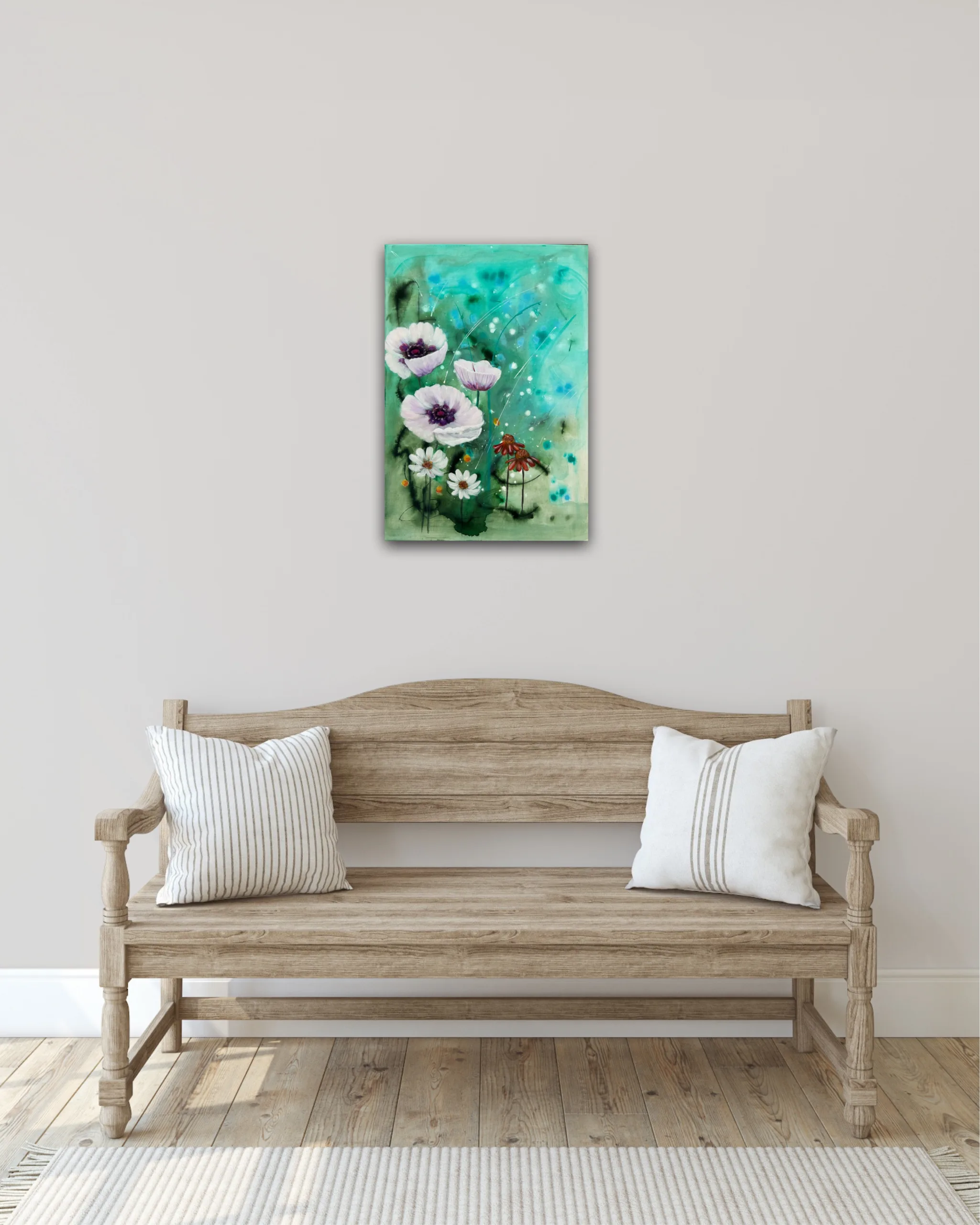 42 x 60 x 2 cm En mjuk, drömsk akryl och oljemålning inspirerad av ängens stilla rörelser. Tavlan fångar naturens viskningar i ljusa, harmoniska toner.